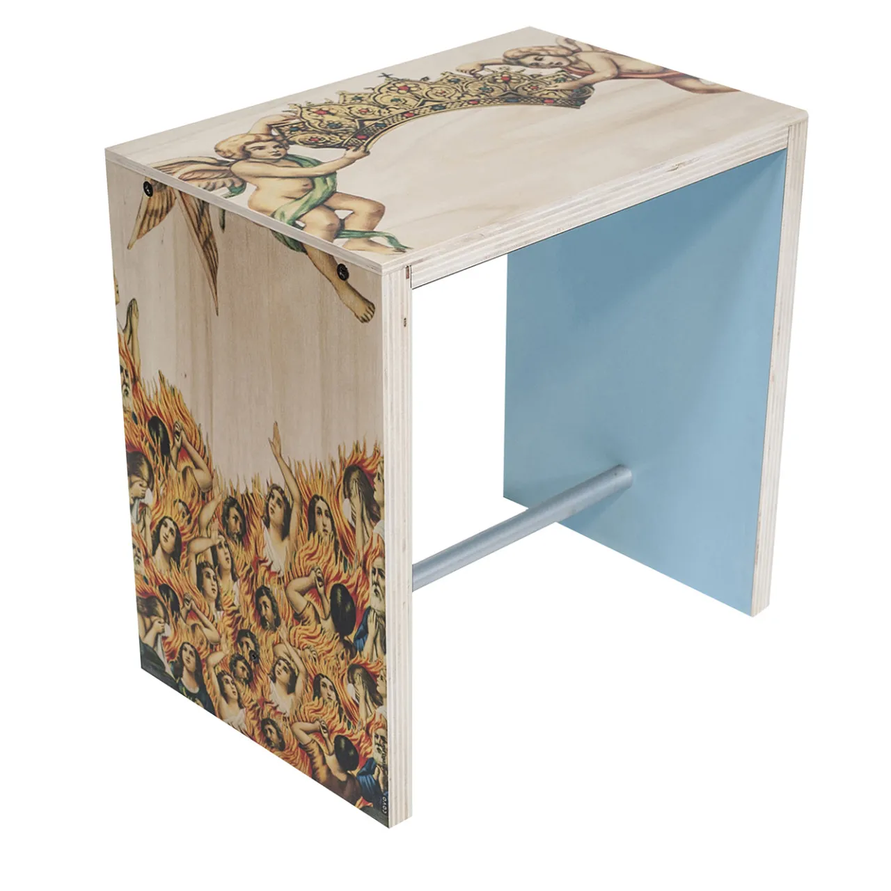 Questo sgabello fa parte di una collezione ispirata all’iconografia popolare del Sud Italia, caratterizzata da motivi decorativi che richiamano il fascino dettagliato dei vicoli storici e degli angoli nascosti. Presenta una superficie naturale stampata e laminata, ispirata al Trono del Carmine, in contrasto con un pannello interno blu intenso e rinforzata da una barra trasversale in metallo per una maggiore stabilità. Il design compatto e raffinato offre una seduta funzionale, arricchita da un tocco di espressività artistica. Design di Marcello Panza.