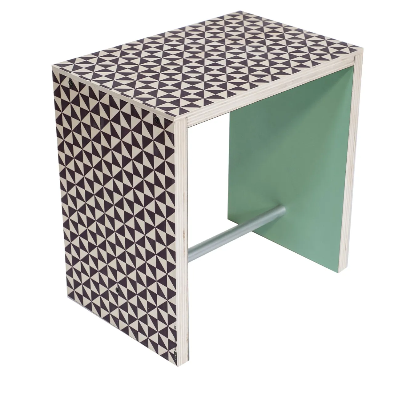 Questo sgabello è caratterizzato da un distintivo motivo geometrico stampato e combina superfici in legno laminato con un audace pannello laterale verde e una barra di supporto in metallo, che conferiscono stabilità e un notevole contrasto visivo. Appartenente a una collezione che omaggia l’iconografia tradizionale del Sud Italia, aggiunge un tocco culturale vivace alla sua forma delicatamente sagomata. Il design compatto lo rende ideale per diversi contesti interni, unendo funzionalità e una marcata espressione artistica. Design di Marcello Panza.