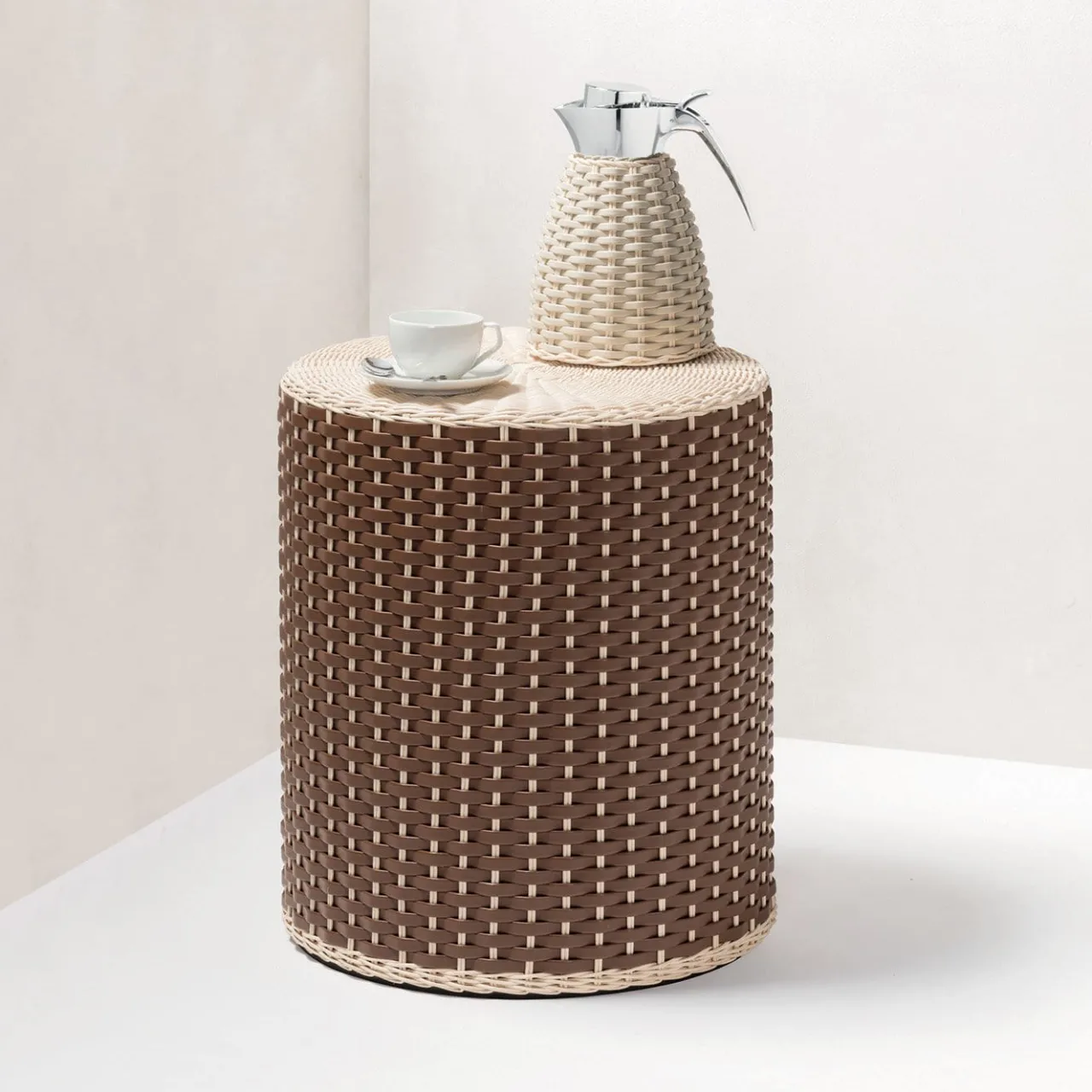 Superlativo esempio di artigianato, questo oggetto d’arte può essere utilizzato come sgabello o tavolino grazie alla sua versatile forma cilindrica. Poggiato su una struttura in legno, è rivestito con un’imbottitura intrecciata a mano composta da pelle marrone (disponibile anche in pelle di Napa) e rattan naturale, che aggiunge un tocco di flessibilità e leggerezza al pezzo.
