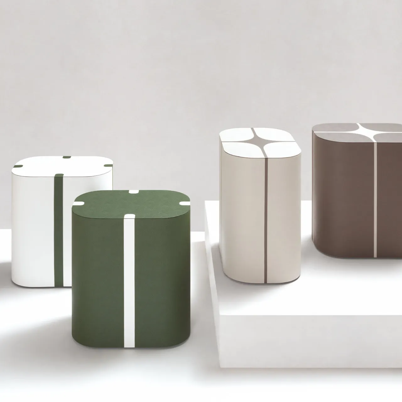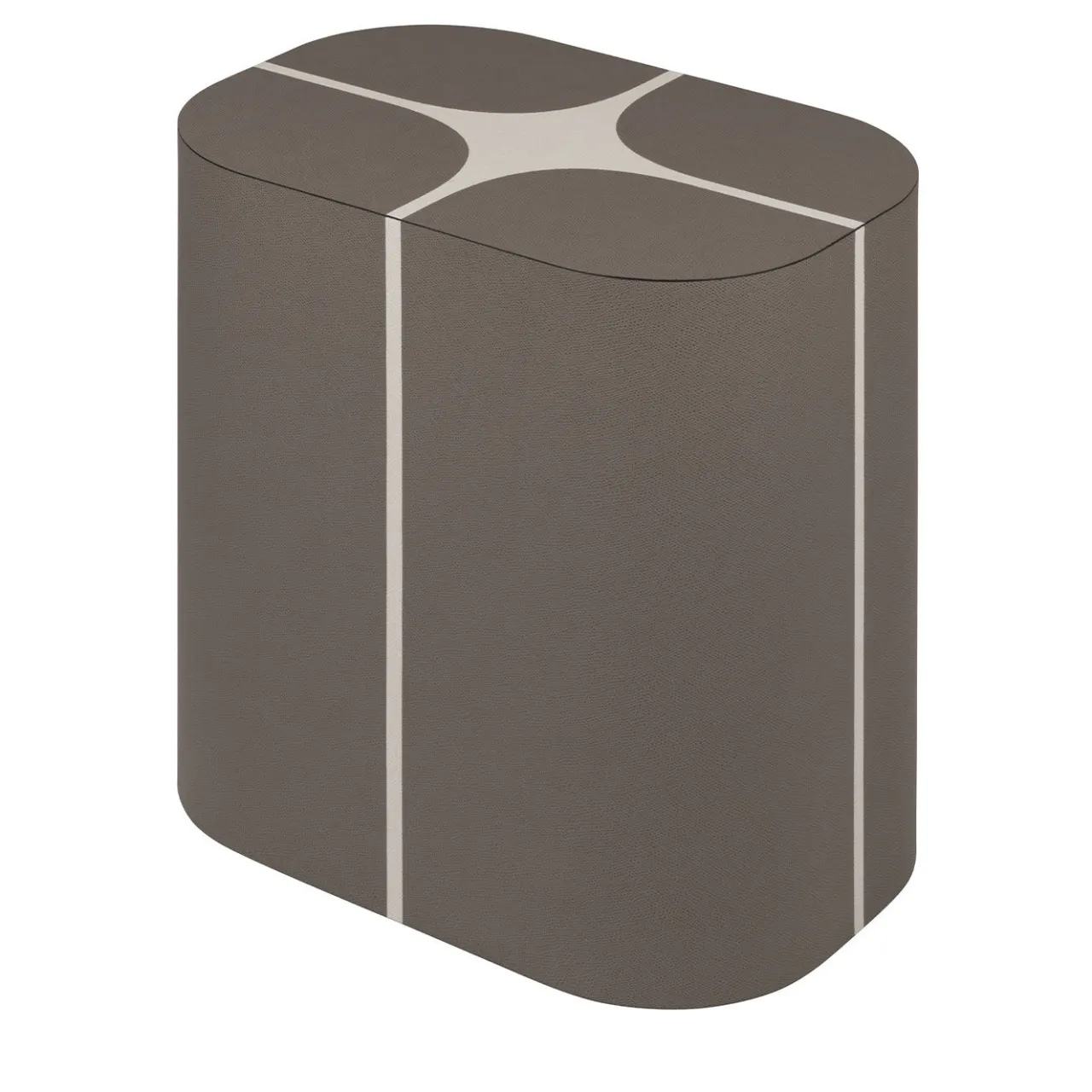 Disegnato da Stéphane Parmentier e disponibile con due motivi di intarsio (linee laterali e linee trasversali), questo sgabello di ispirazione Art Déco può essere utilizzato anche come tavolino ed esposto in multipli in una tavolozza di colori coordinati. Rivestito in morbida pelle marrone con intarsi a croce color avorio, la base di questo sgabello dagli angoli arrotondati è leggermente sollevata da terra e dotata di rotelle girevoli nascoste che consentono di spostarlo facilmente.