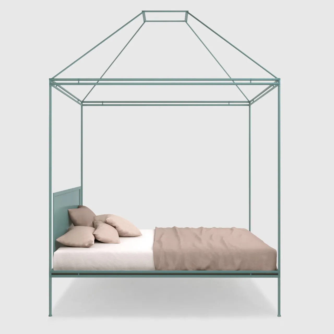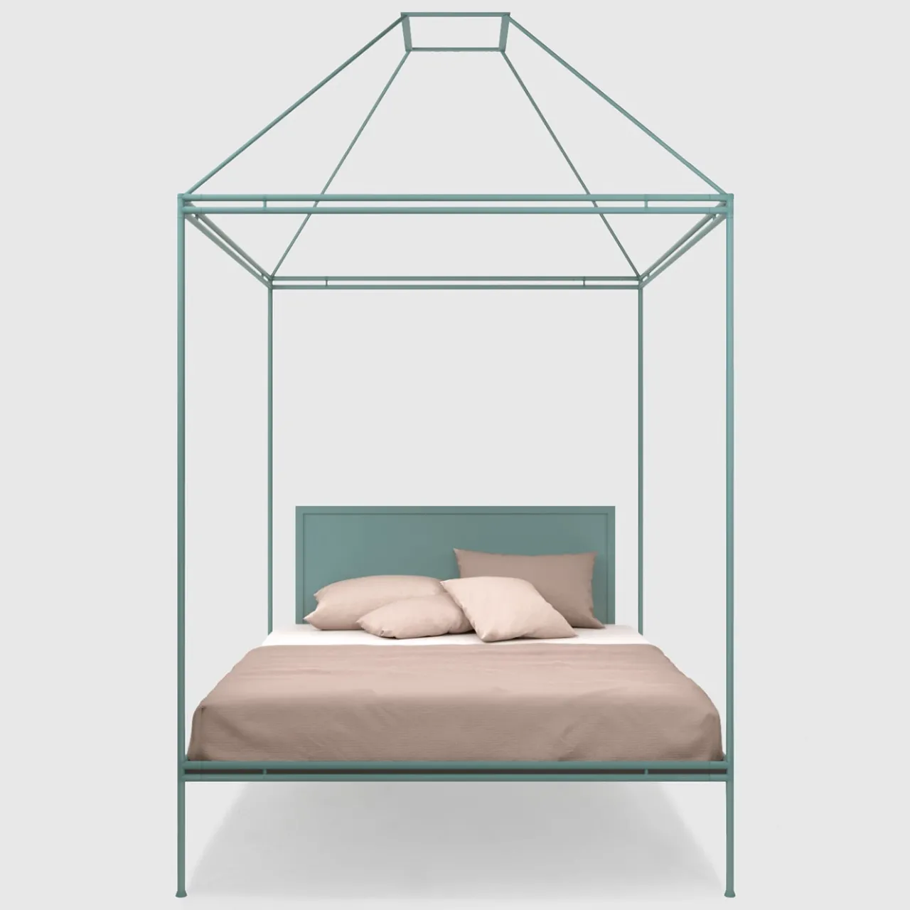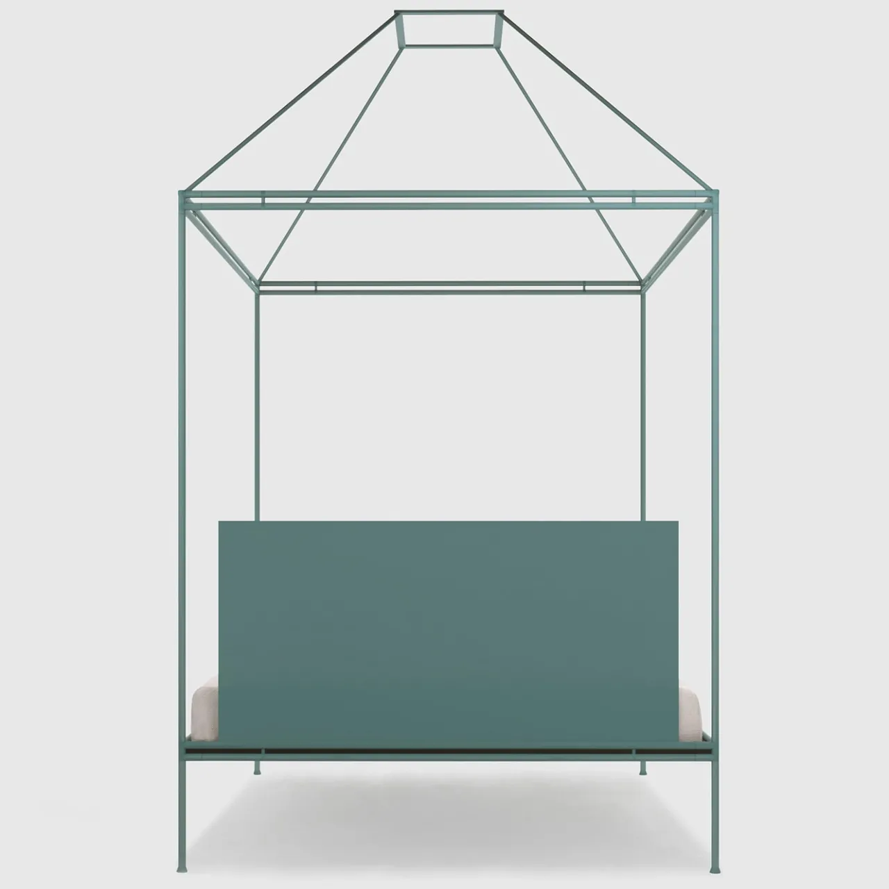 Il senso di calore e rassicurazione che trasmettono i caminetti ha ispirato la struttura geometrica a baldacchino di questo letto matrimoniale, il cui design sintetizza brillantemente poesia e razionalismo. Rifinita in azzurro, la struttura in ferro battuto combina profili a taglio tondo e a taglio quadrato, tracciando una silhouette al tempo stesso ariosa e audace. La testata è stata realizzata con una lastra di metallo cilindrica e insonorizzata. Grazie a frizioni segrete, la struttura può essere smontata.