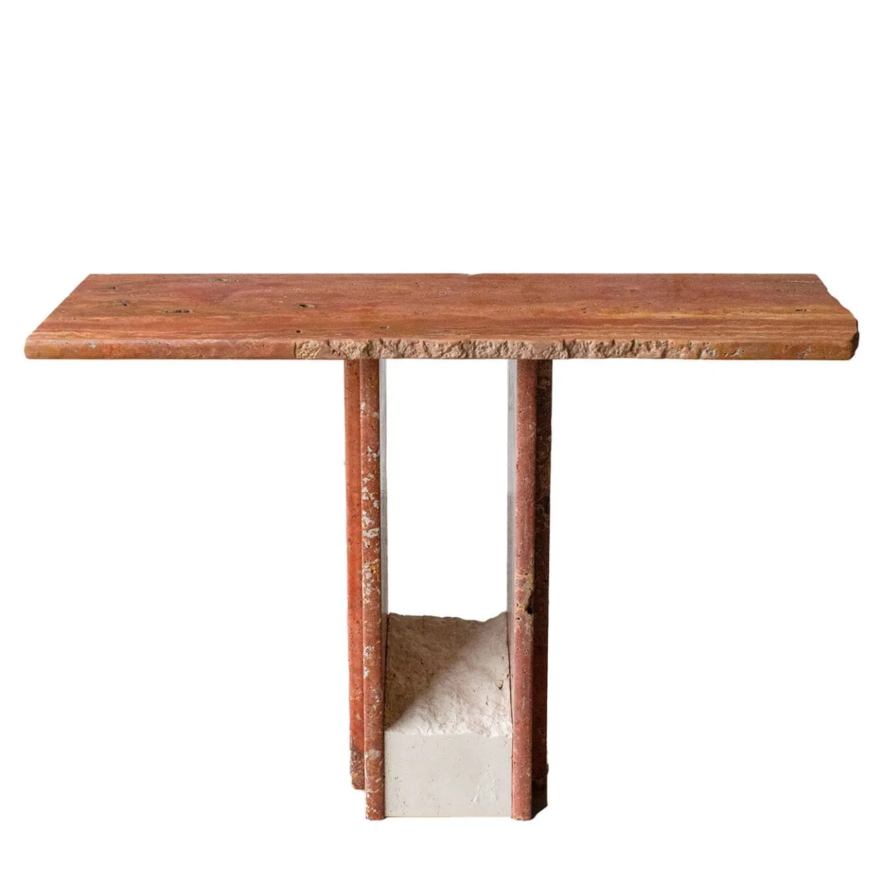 Questa originale consolle ha una forma elegante e sofisticata, arricchita da un decorativo ma funzionale massello di marmo alla base. Questo pezzo moderno è composto da tre pannelli che formano il piano e le gambe in Travertino Rosso Persiano, con l’elemento solido strutturale al centro in Travertino Romano.