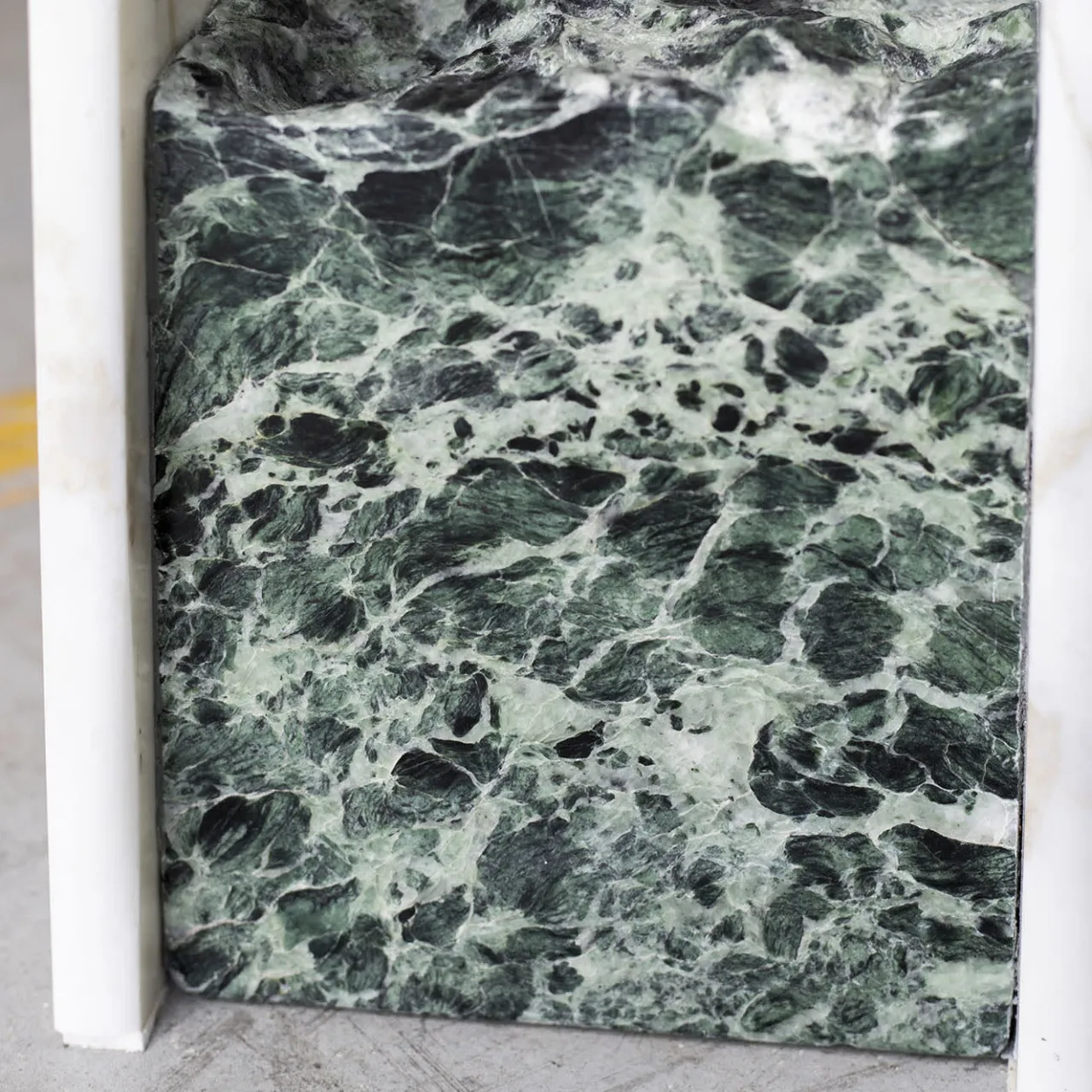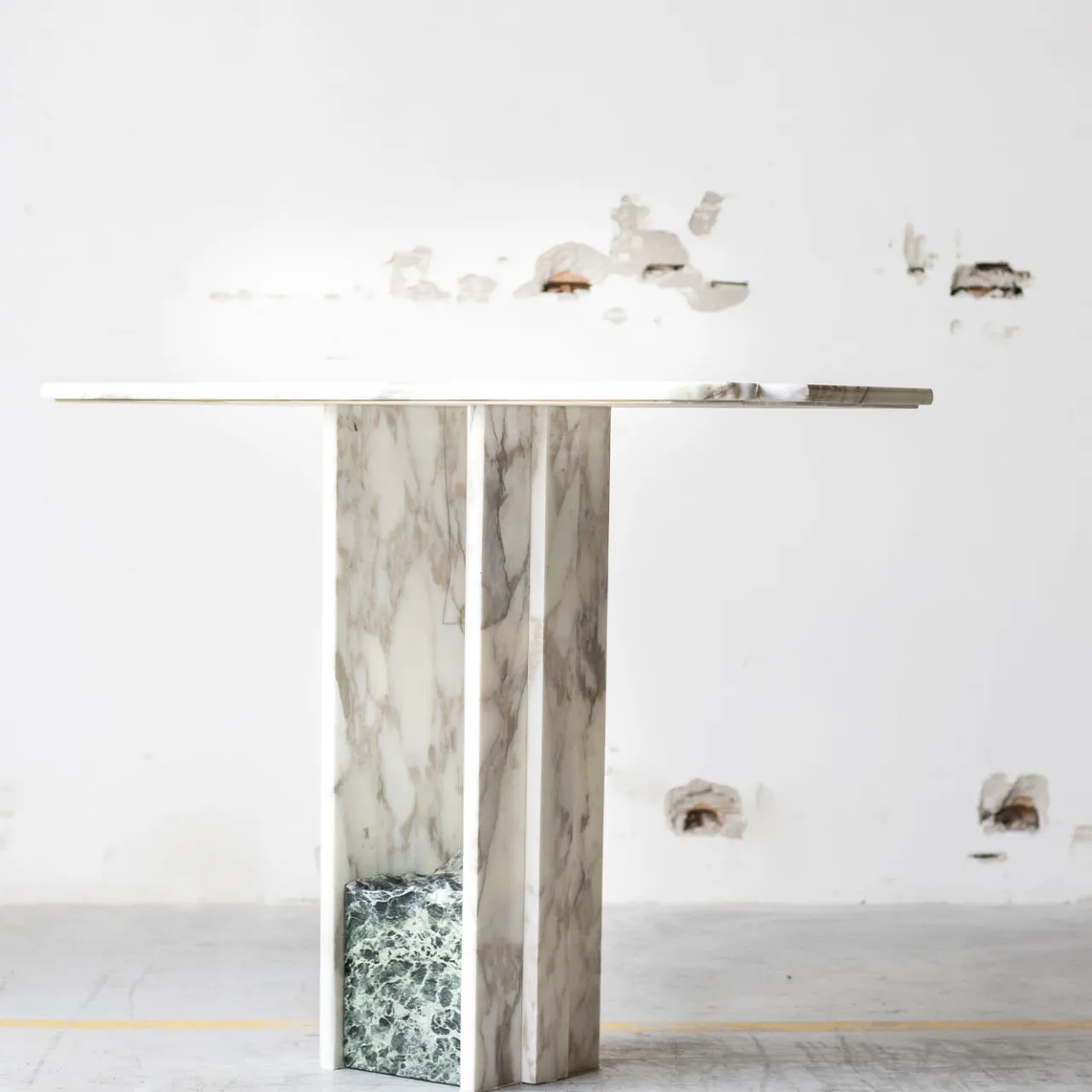 Originale consolle dalla forma elegante e sofisticata arricchita da un decorativo ma funzionale massello di marmo alla base. Questo pezzo moderno è composto da tre pannelli che formano il piano e le gambe in Calacatta Oro, con l’elemento strutturale in Verde Alpi.