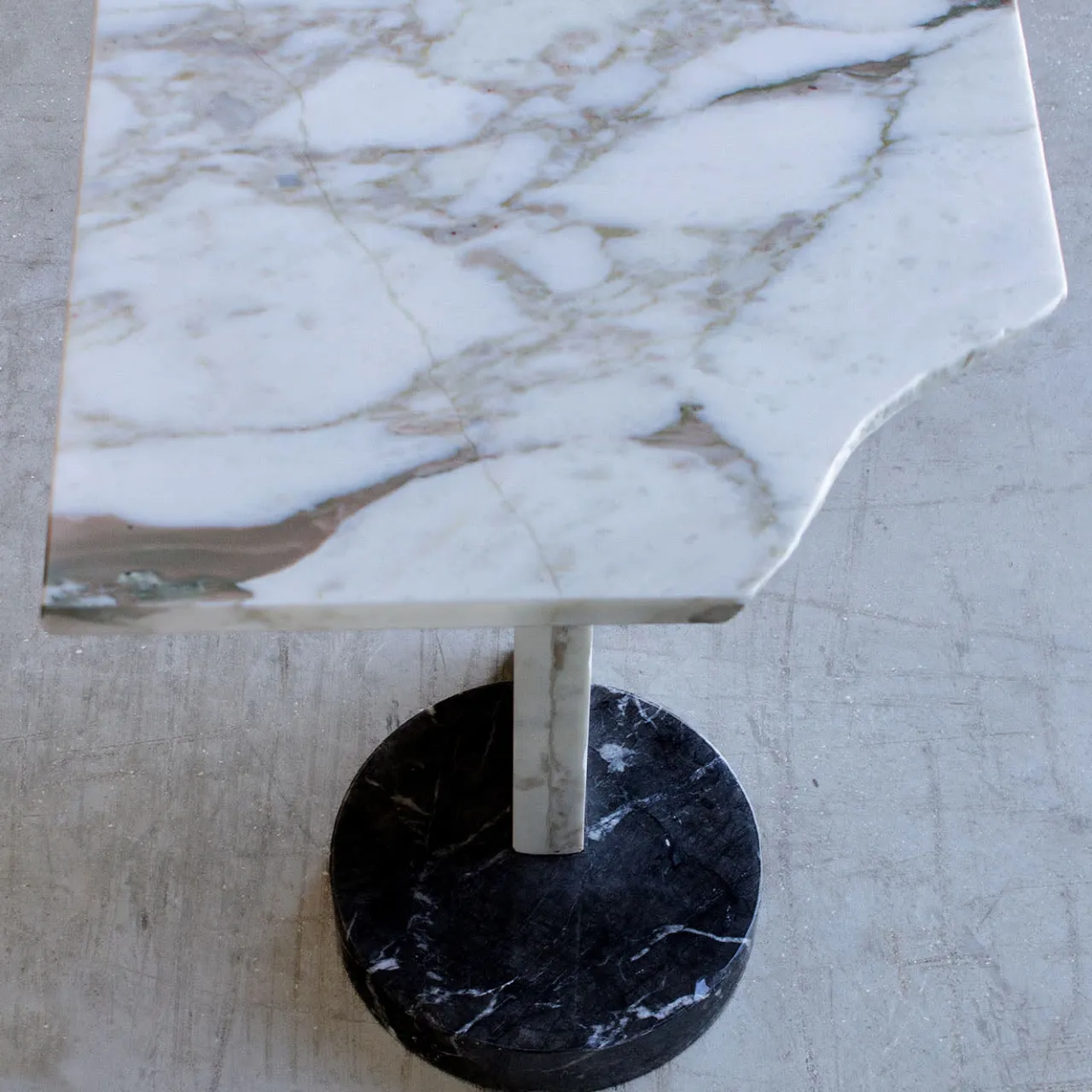 Il tavolino combina due eleganti lastre di marmo e un piano irregolare. La solida base nera aggiunge una scultura funzionale che gioca con la geometria, l’equilibrio e la natura per elevare l’aspetto di qualsiasi spazio abitativo contemporaneo. Il piano e la struttura sono in marmo Calacatta Oro, mentre la base in Marquina.
