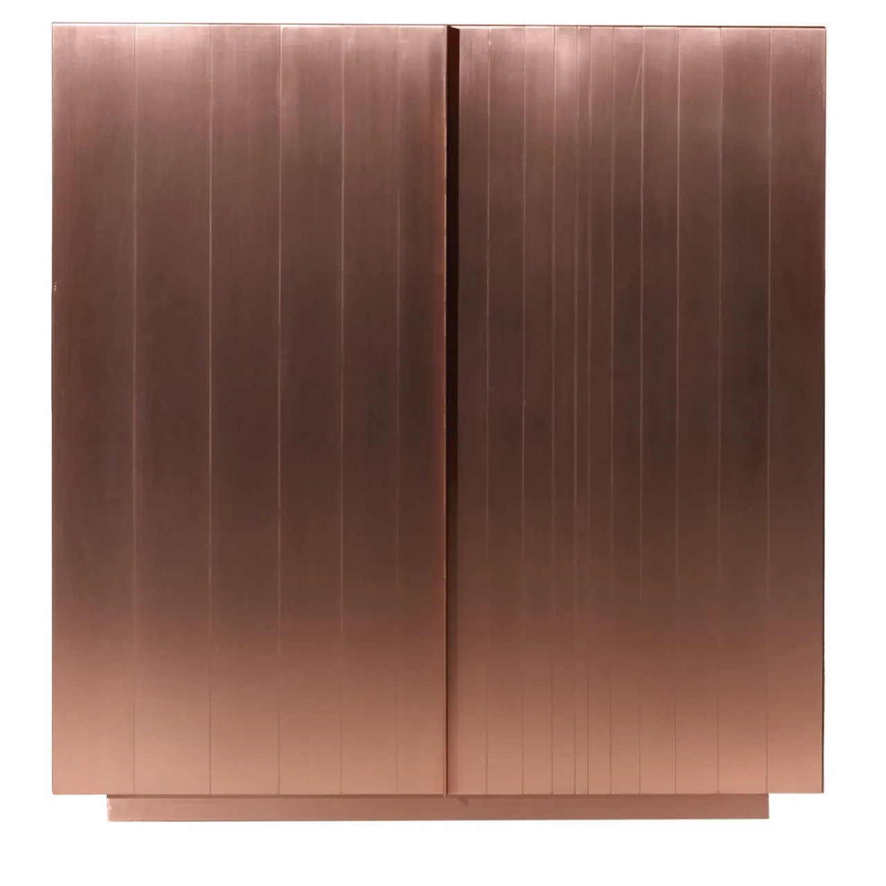 Un pezzo straordinario che si abbina perfettamente alle case industrial-chic, questa maestosa credenza è abilmente lavorata e rifinita a mano. Il mobile interno impiallacciato in legno con finitura noce è dotato di tre cassetti e un ripiano, mentre il guscio esterno presenta strisce di rame satinato di straordinario fascino visivo.