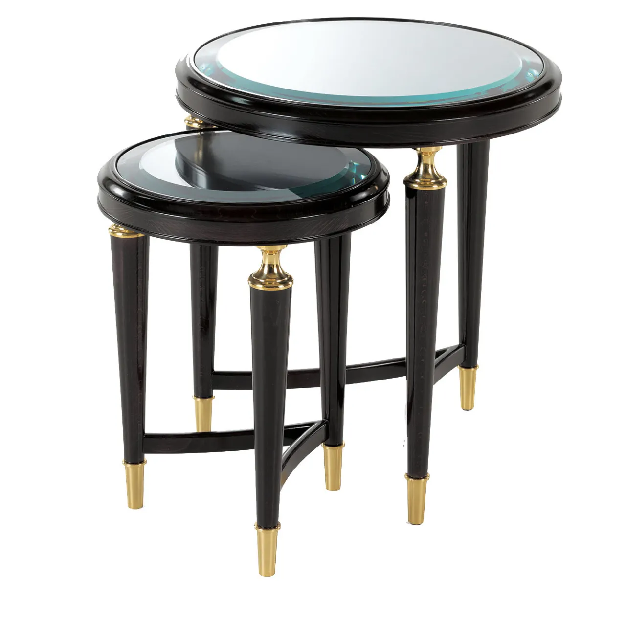Questo incantevole set di due tavolini da salotto è un’aggiunta preziosa e versatile a un arredamento classico. Insieme, in coppia o esposti separatamente, questo duo aggiungerà eleganza e un’allure retrò a un salotto. La struttura di ciascun pezzo è in legno con finitura in ebano scuro e dettagli in ottone nella parte superiore e inferiore delle tre gambe, collegate da elementi curvi a forma di V. I piani rotondi sono in legno smussato. I piani rotondi sono in vetro smussato. Il pezzo superiore è alto 55 cm e ha un diametro di 50 cm, quello inferiore è alto 46 cm e ha un diametro di 46 cm.