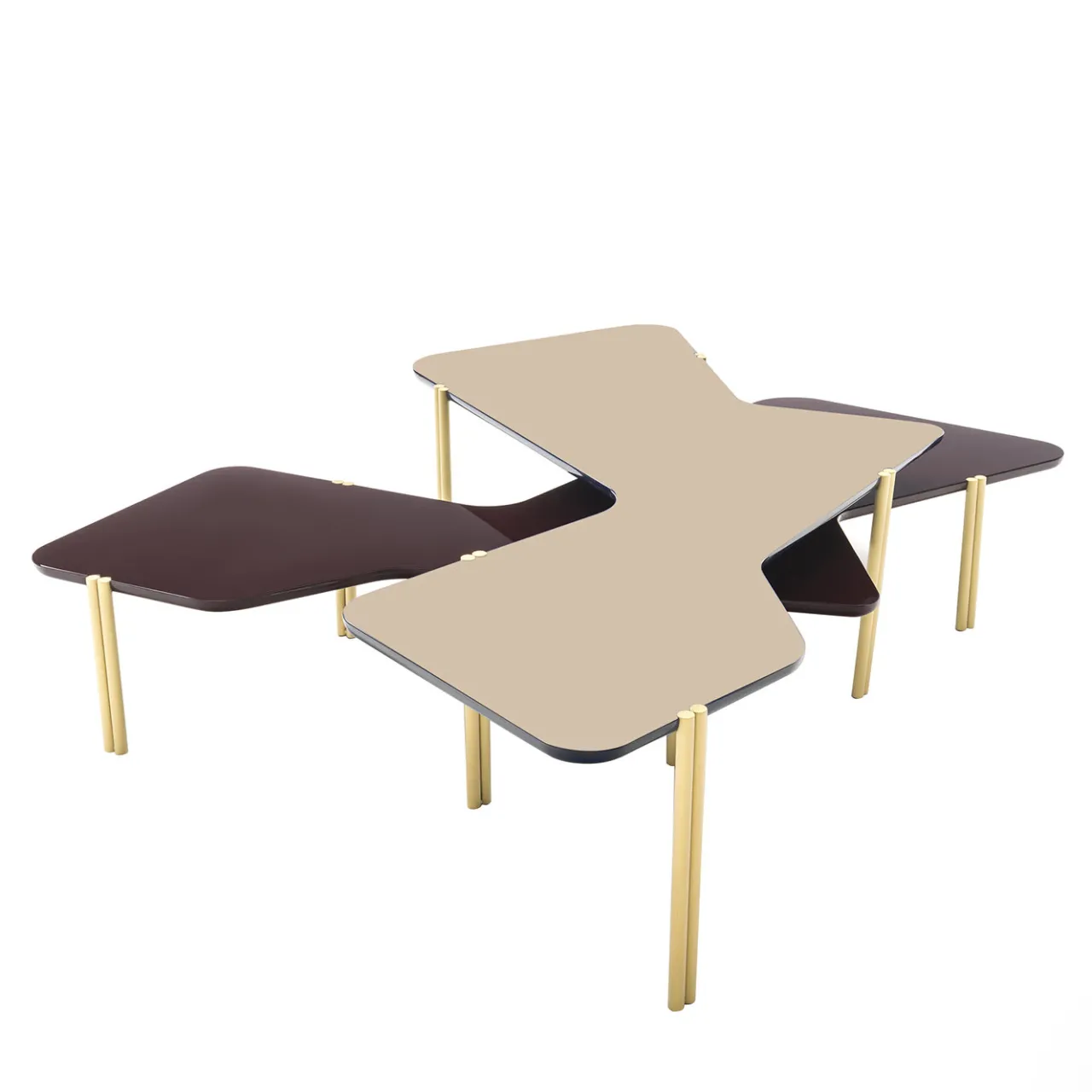 Questi tavoli asimmetrici fanno parte di una selezione curata presentata all’evento Living Objects Fuorisalone di Artemest durante la Milano Design Week 2019. Ispirati alle composizioni astratte dell’artista dadaista Hans Arp, questi tavoli presentano piani in legno di forma irregolare con finitura laccata in una raffinata combinazione di colori, cremisi per il tavolo inferiore e rosa per il piano. Sostenuti da cinque gambe in ottone a doppio cilindro, possono essere impilati insieme come un accattivante tavolino da caffè o esposti separatamente per aggiungere un’estetica visivamente affascinante e un tocco distintivo a un salotto moderno o all’arredamento di un ufficio.