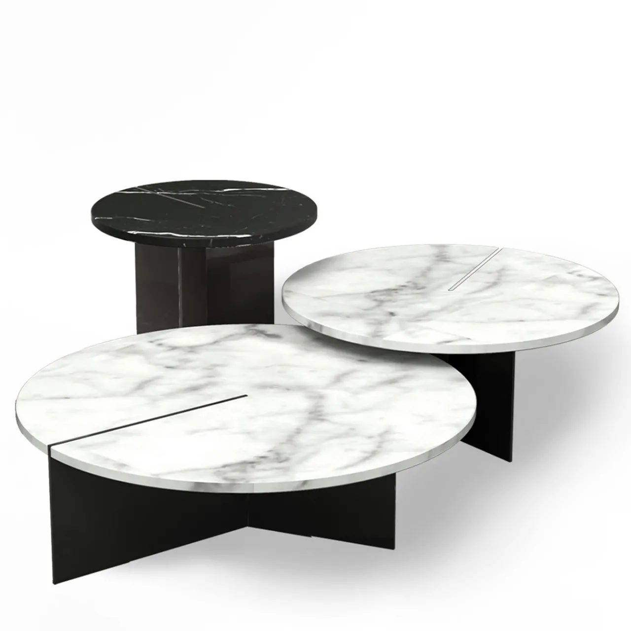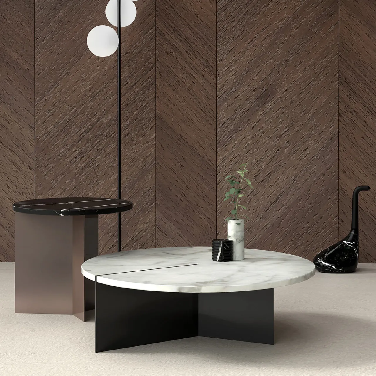 Tre lastre di metallo bronzato che convergono verso una base dinamica rivelano immediatamente il fascino minimalista di questo tavolino. Sigillato da un piano rotondo in pregiato marmo di Marquinia, la sua silhouette slanciata suggerisce una collocazione perfetta in raffinati soggiorni in stile contemporaneo o in studi privati. Si prega di contattare il Concierge per le diverse dimensioni e per la variante con piano in marmo di Carrara e base bronzata.