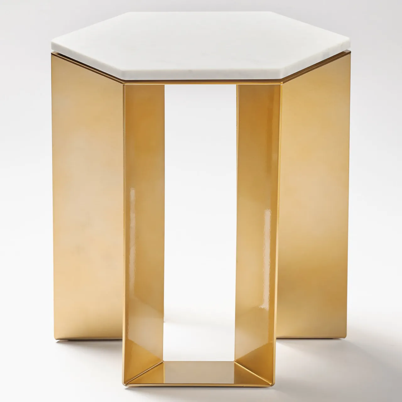 Design pulito ed equilibrato dell’artista Antonio Saporito, questo tavolino appartiene a una raffinata serie creata dall’artista Antonio Saporito per gli interni contemporanei. Elegante e raffinato, poggia su una base in metallo laccato oro con gambe leggere e slanciate, che sostiene un piano di forma esagonale squisitamente realizzato in marmo bianco. Per ulteriori dettagli, consultare il Concierge.