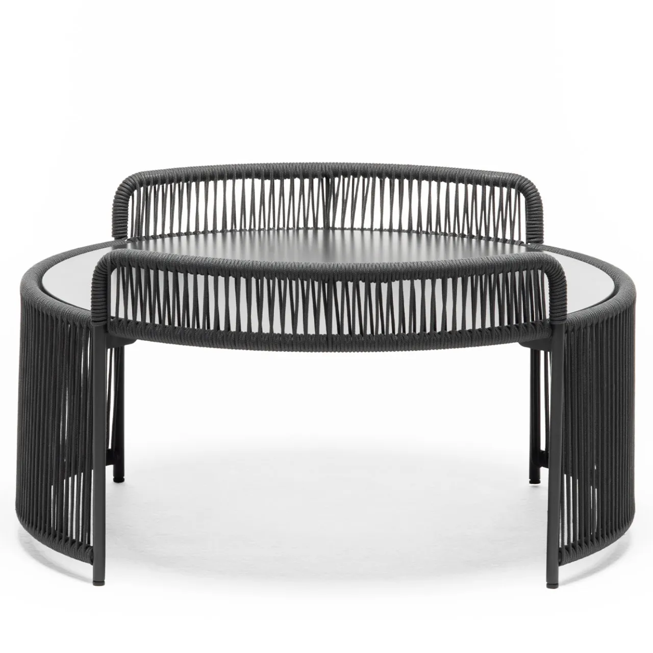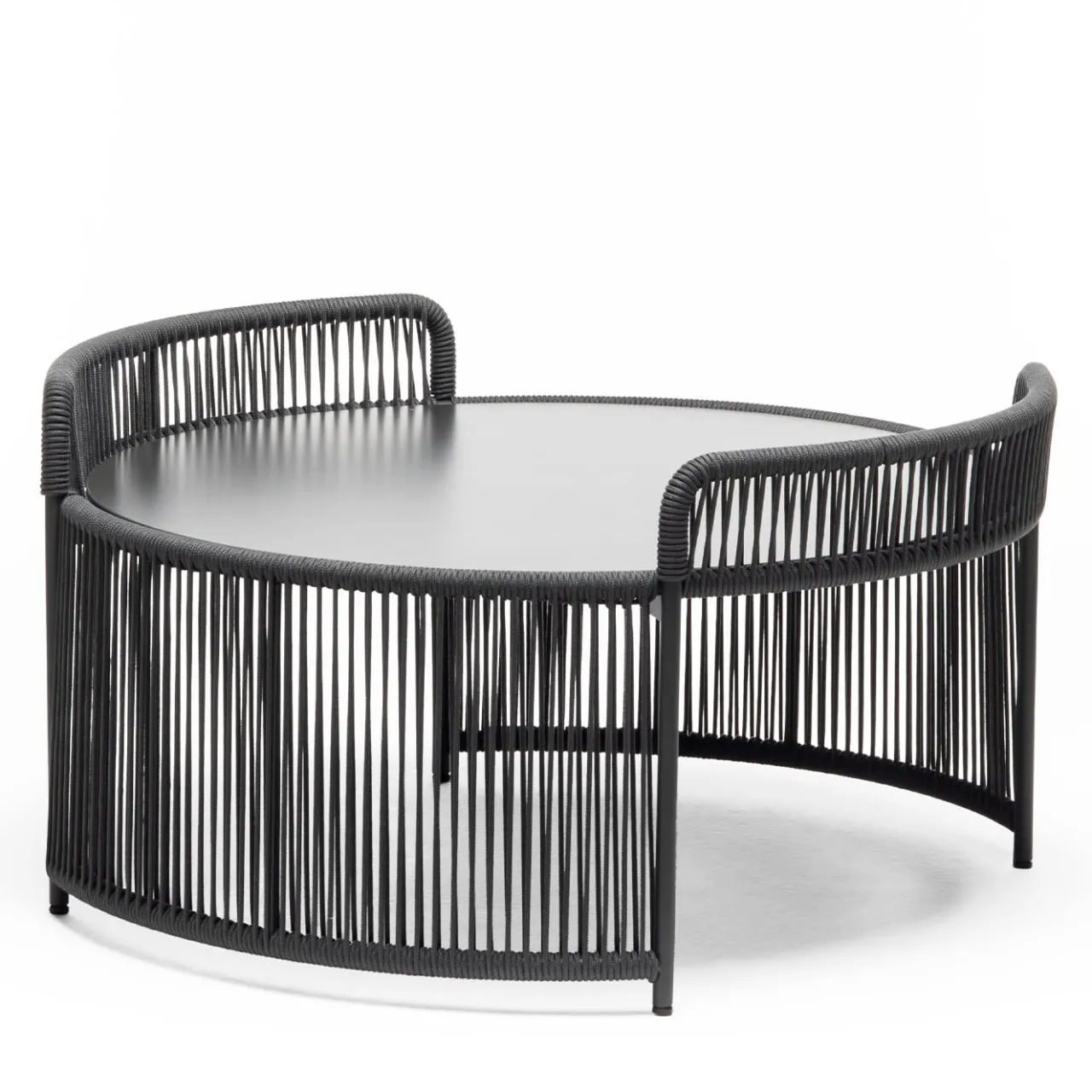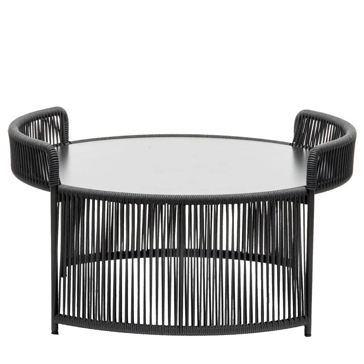 Eccellente artigianalità e fascino evocativo si fondono in questo elegante tavolino, pensato per valorizzare i moderni contesti outdoor. La struttura cilindrica in acciaio verniciato a polvere in grigio antracite viene avvolta da una corda marina in tinta, abilmente combinata in un motivo dinamico che conferisce al pezzo un aspetto stimolante e arioso. Completa il tutto un piano rotondo in HPL affiancato da elementi curvi. Per altre dimensioni e colori, consultare il catalogo Artemest.