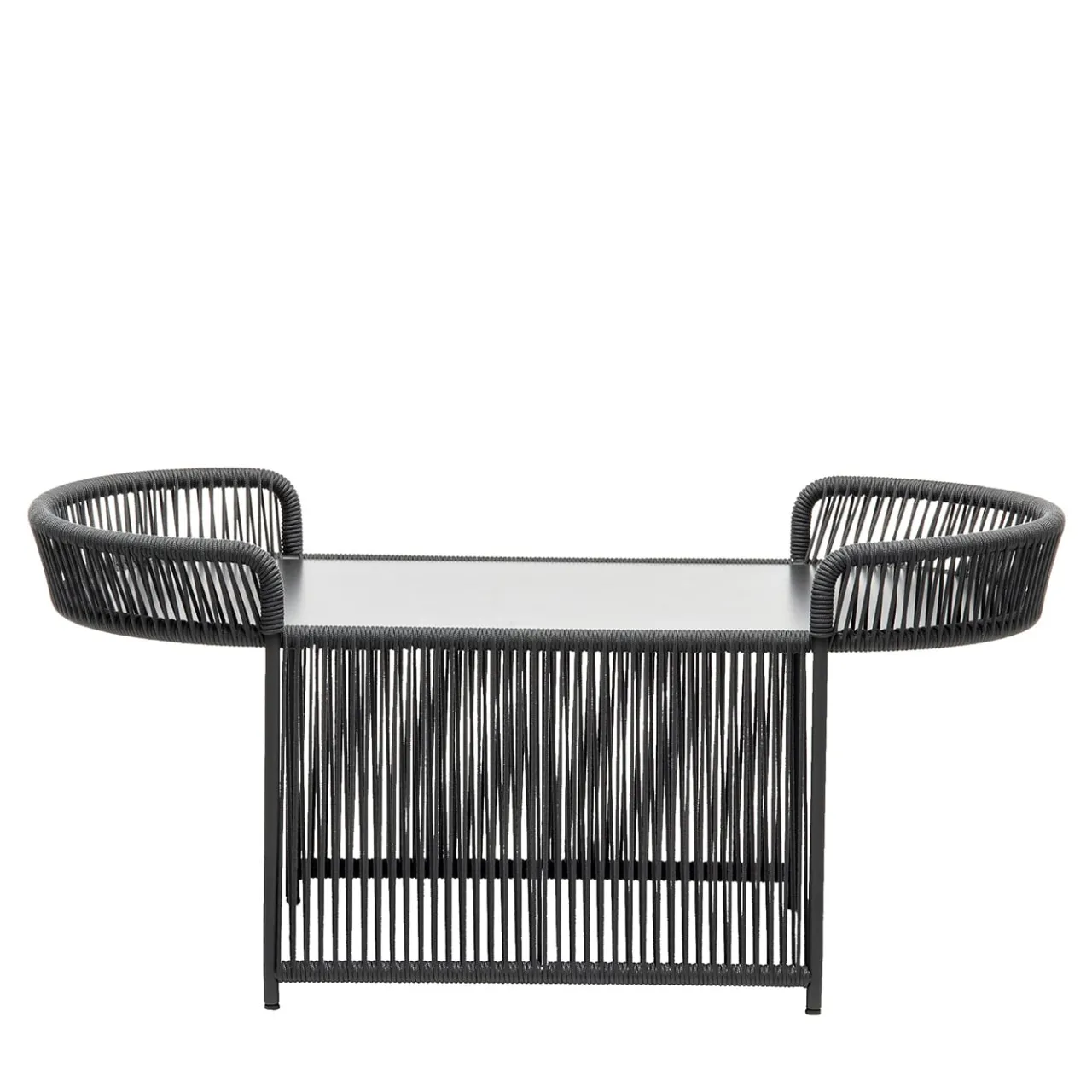 Magistralmente avvolte a mano attorno a una robusta ed elegante struttura in acciaio verniciato a polvere in grigio antracite, le corde marine conferiscono a questo tavolino da esterno il suo caratteristico carattere dinamico e arioso. Il piano in HPL, allungato e in tinta, ha i lati arrotondati abbracciati dagli elementi curvi della struttura, in armonioso contrasto con quelli affusolati che caratterizzano la base. Per altre dimensioni e colori, consultare il catalogo Artemest.