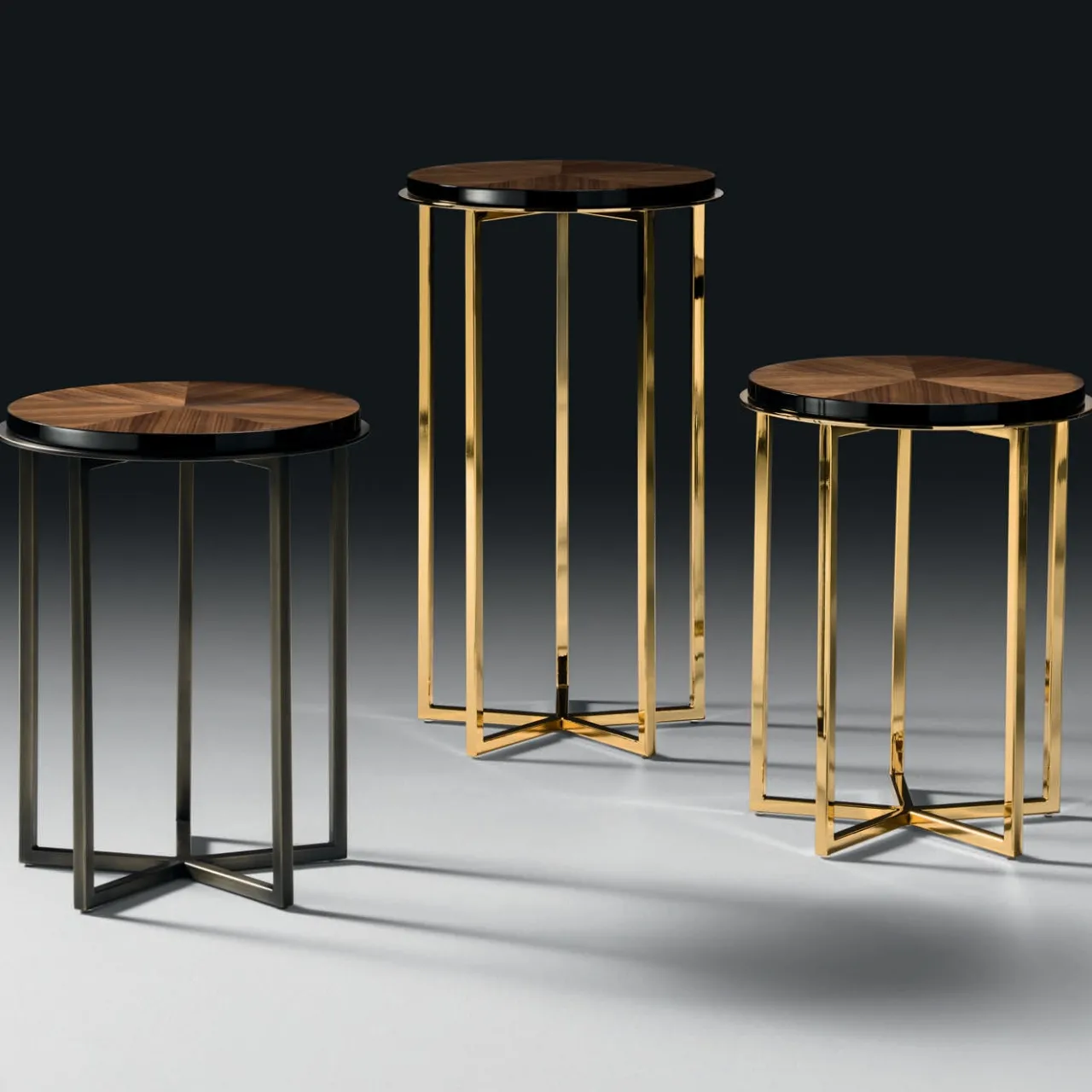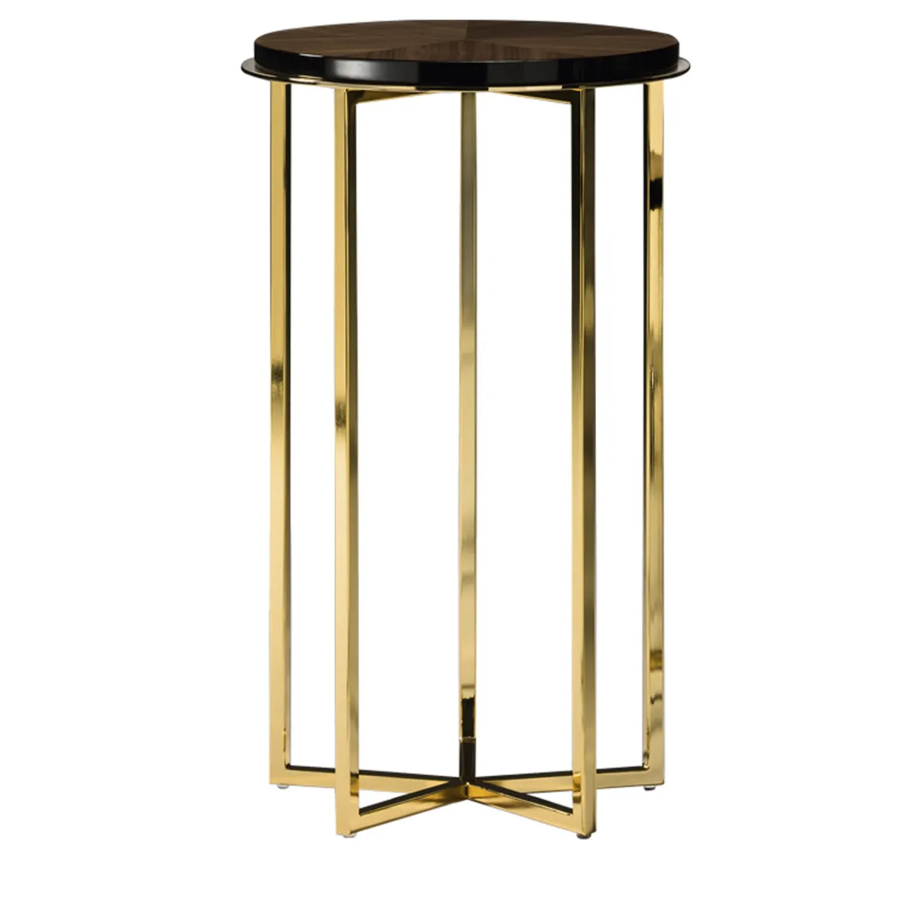 La struttura di questo tavolino rotondo in metallo ha una suggestiva finitura dorata. Il piano è in legno di noce canaletto.