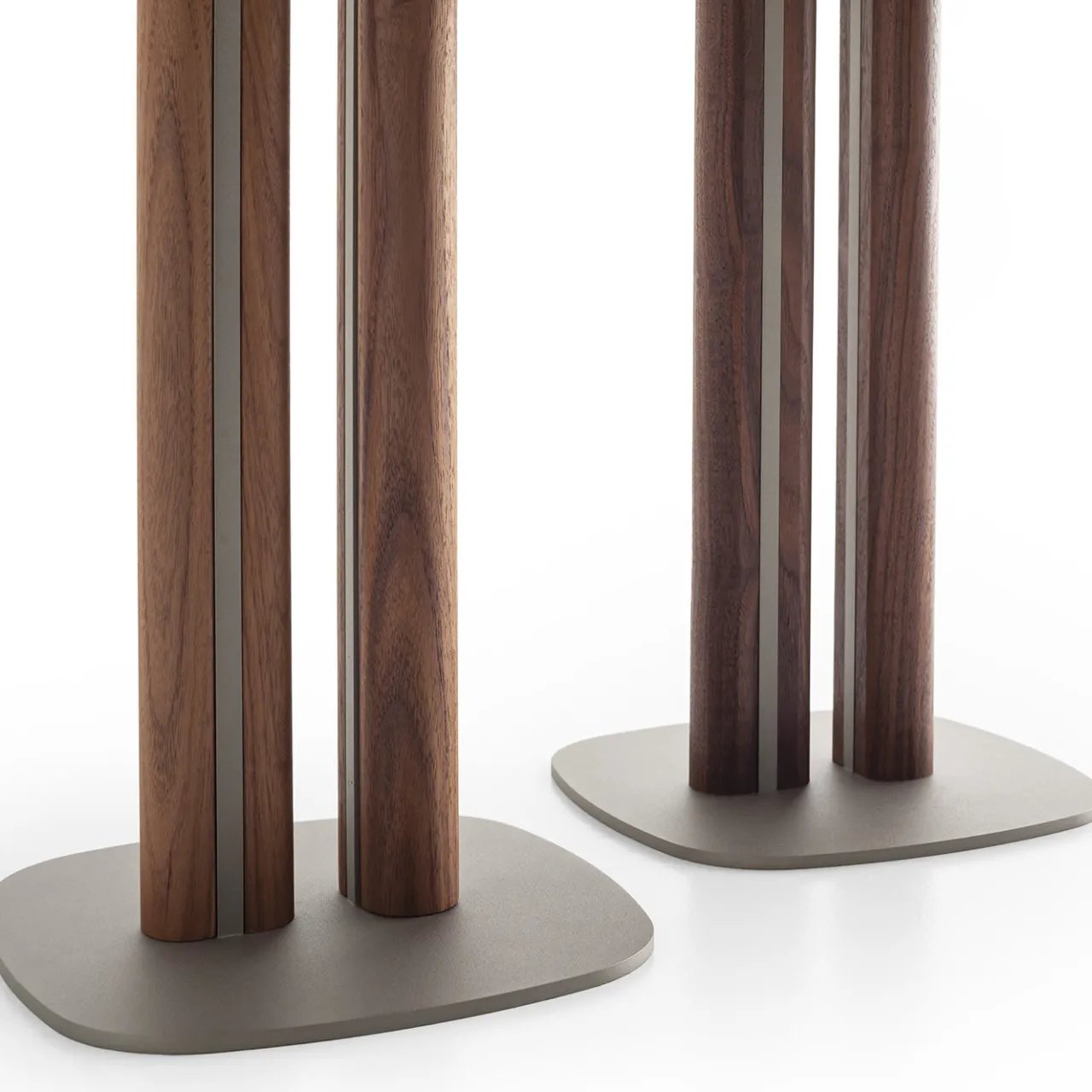 Dinamico nella sua silhouette asimmetrica, questo tavolino è stato concepito come elegante attualizzazione di Manhattan. I fiumi che costeggiano l’isola sono evocati dagli elementi in massello di noce canaletto che sostengono la robusta base in metallo rifinita in champagne con polveri epossidiche. Il noce canaletto è presente anche nella parte superiore, dove si presenta come un’affascinante impiallacciatura calda.
