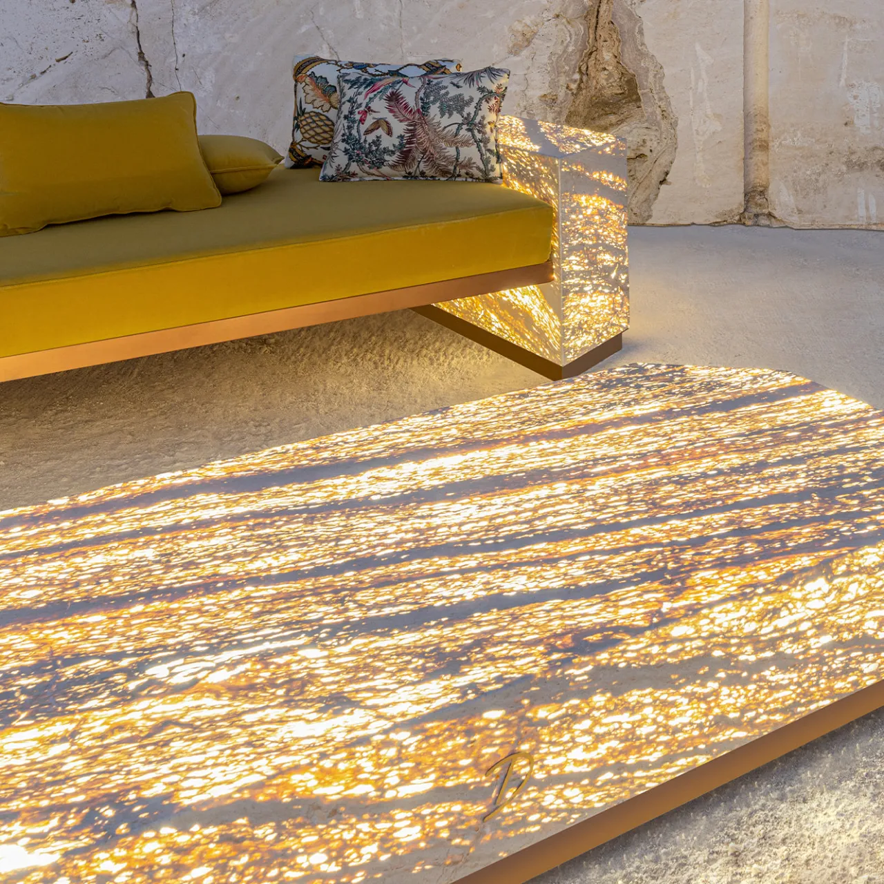 Un tavolino basso che diventa pura luce. Realizzato in travertino Santa Caterina, alleggerito e retroilluminato grazie alla sua naturale porosità, questo tavolino trasforma la pietra in una superficie luminosa, capace di creare atmosfere suggestive e riflessi dorati che mutano nel corso della giornata. La struttura, arricchita da dettagli in acciaio e rifinita con una resina epossidica protettiva, garantisce durabilità e alte prestazioni anche in ambienti esterni. L’illuminazione a LED dimmerabile, certificata IP65, può essere comodamente controllata tramite telecomando o app, aggiungendo magia e funzionalità all’esperienza outdoor. Un pezzo scultoreo che unisce design, artigianalità e poesia visiva. Inclusa una copertura protettiva su misura.