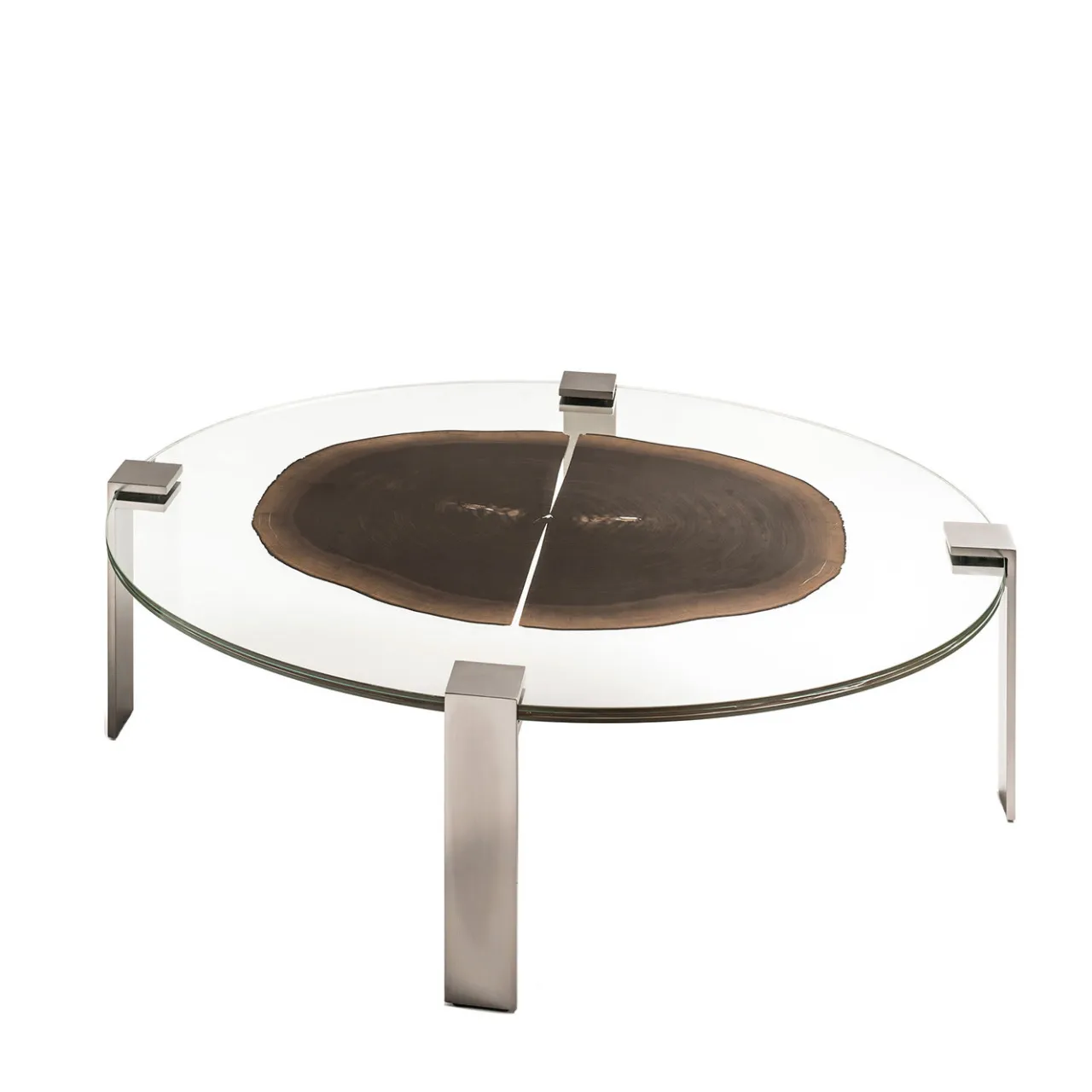 Questo suggestivo tavolino fa parte della collezione Glass&Wood ed è composto da due strati di vetro che contengono una sottile sezione di una fetta di albero. L’unicità del pezzo di legno e le sue sorprendenti venature naturali gli conferiscono una qualità unica. Il design moderno e l’allure contemporanea sono esaltati dalle quattro gambe in metallo, disponibili in varie finiture, tra cui i colori che si abbinano al tipo di legno racchiuso nel piano.