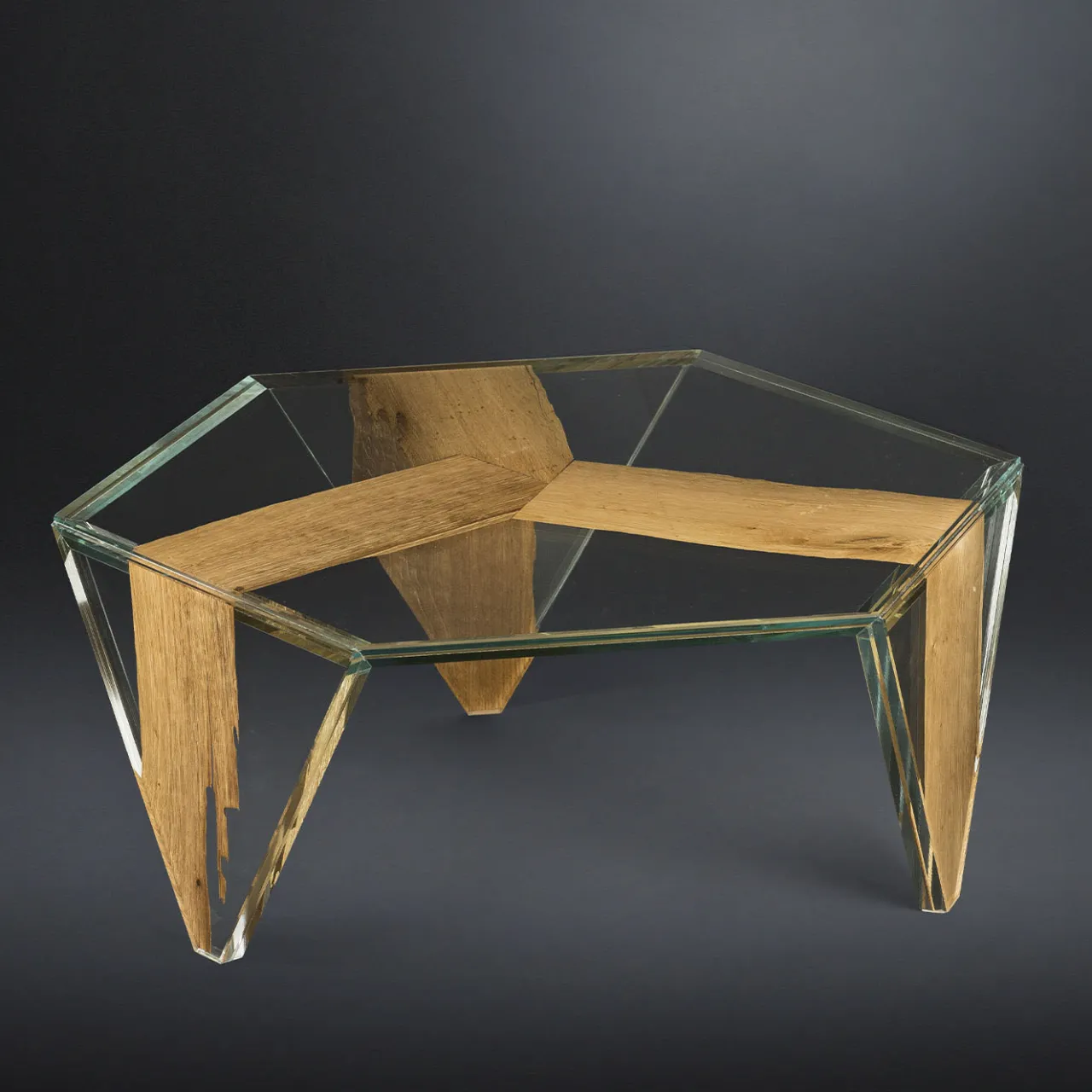 Questo raffinato pezzo fa parte della serie di tavolini esagonali Ruche e può stare da solo o essere abbinato ad altri tavolini della stessa serie. Il suo aspetto suggestivo è costituito da due strati di vetro che contengono tre sezioni di briccola, i pali di rovere e quercia che per mille anni sono stati collocati nella laguna di Venezia per guidare le imbarcazioni. Parte della collezione Glass&Wood, questo pezzo può essere abbinato ad altri tavolini della collezione per un effetto di grande impatto.