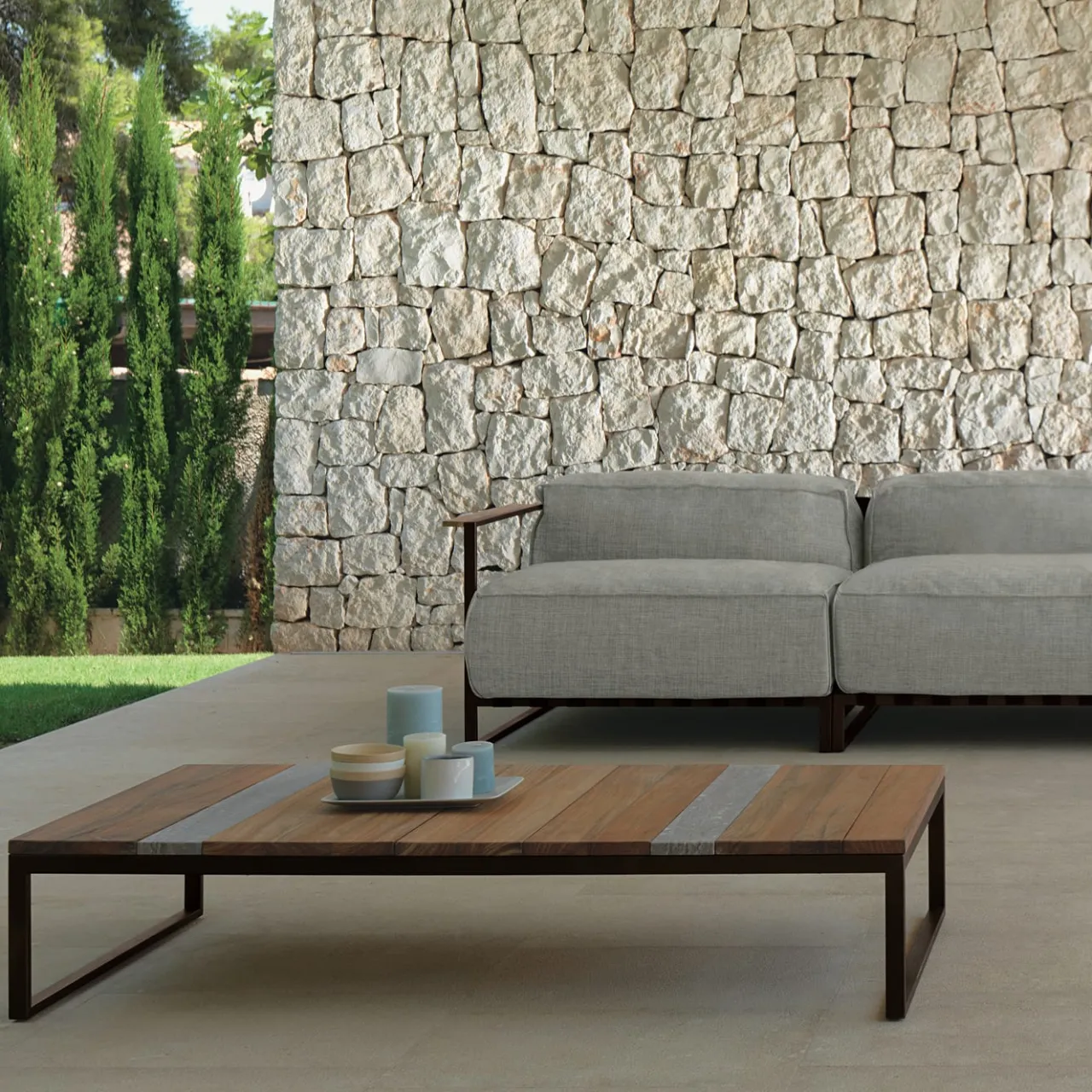 Elegante e unico, questo caffè è stato realizzato pensando alla natura. Caratterizzato da una silhouette slanciata, un telaio in acciaio inox verniciato a polvere nera sostiene un piano rettangolare composto da doghe di iroko, un resistente legno africano simile al teak con un colore marrone dorato. Il motivo a righe è impreziosito da due doghe di travertino titanio che aggiungono un contrasto materico. Un pezzo d’arredamento di rara eleganza e senza tempo, questo tavolino da caffè spicca in qualsiasi interno. La struttura è disponibile anche con finitura oro e bianco, o con struttura grafite e legno di pietra.