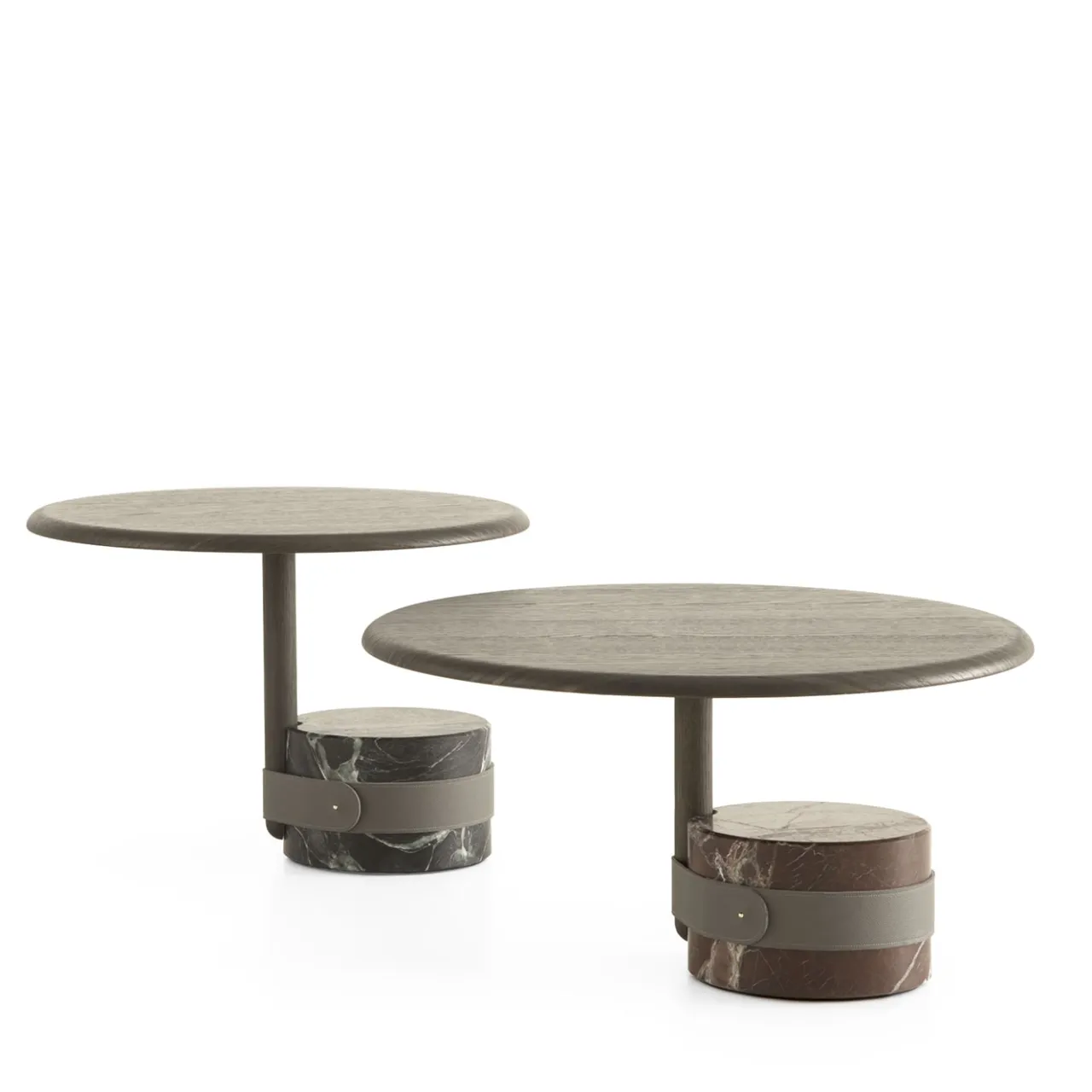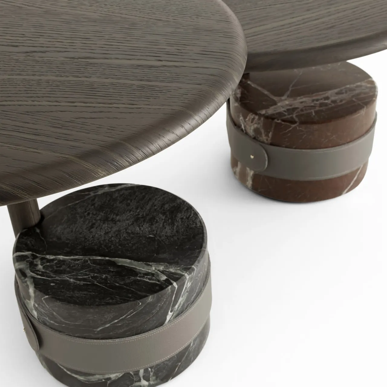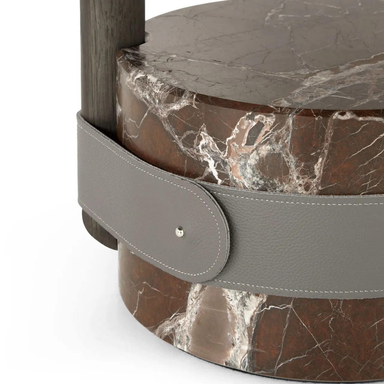 Caratterizzato da una base in marmo rosso Lepanto con finitura satinata opaca, questo accattivante tavolino incarna l’eleganza. La fibbia in pelle antracite aggiunge un tocco di raffinatezza. La struttura in rovere massiccio, perfettamente tinta per completare il piano in MDF arrotondato, presenta una raffinata impiallacciatura in rovere Laguna realizzata con tecniche avanzate di pressatura a membrana. Questo squisito tavolo fonde perfettamente il lusso con il design contemporaneo, rendendolo un’aggiunta straordinaria a qualsiasi spazio abitativo raffinato.
