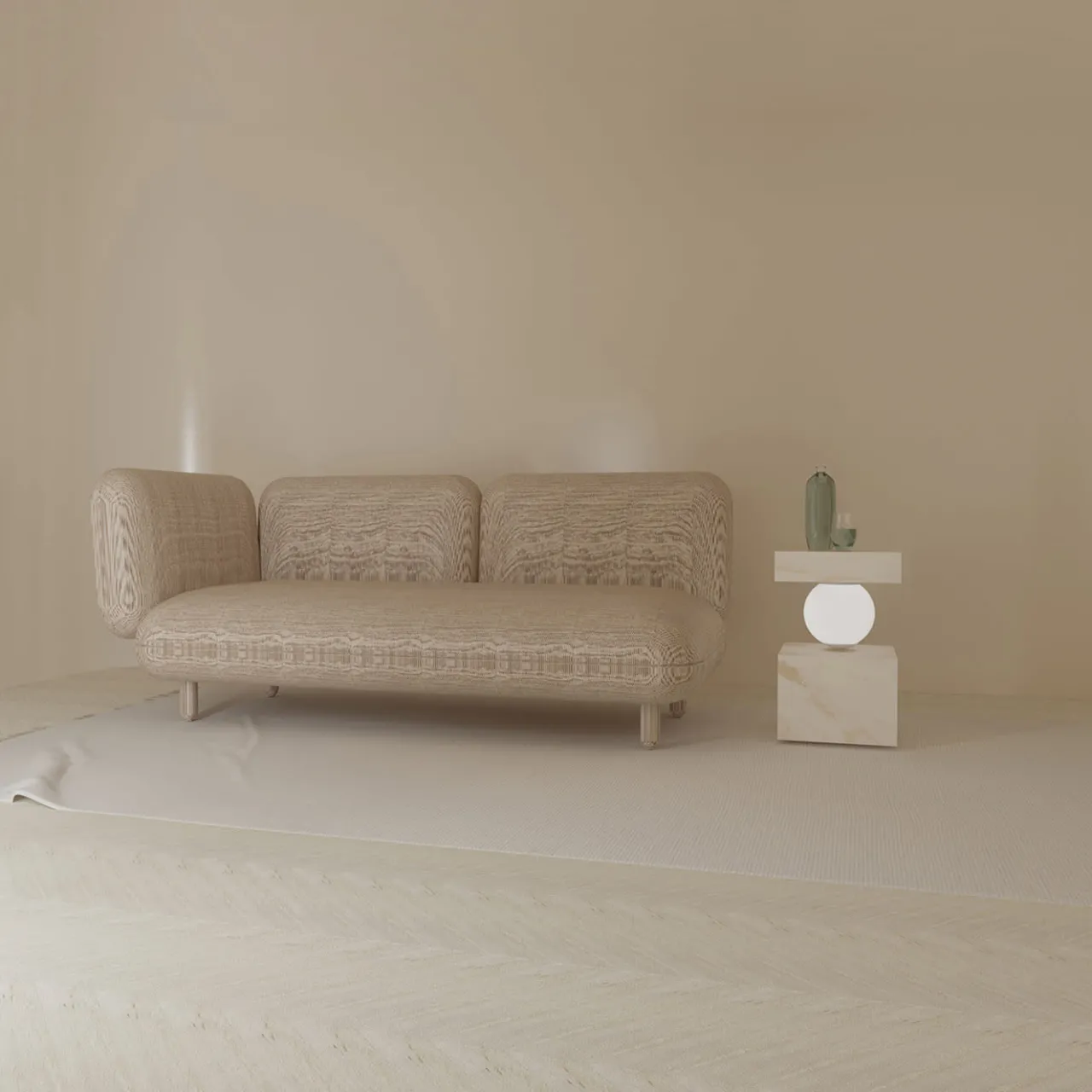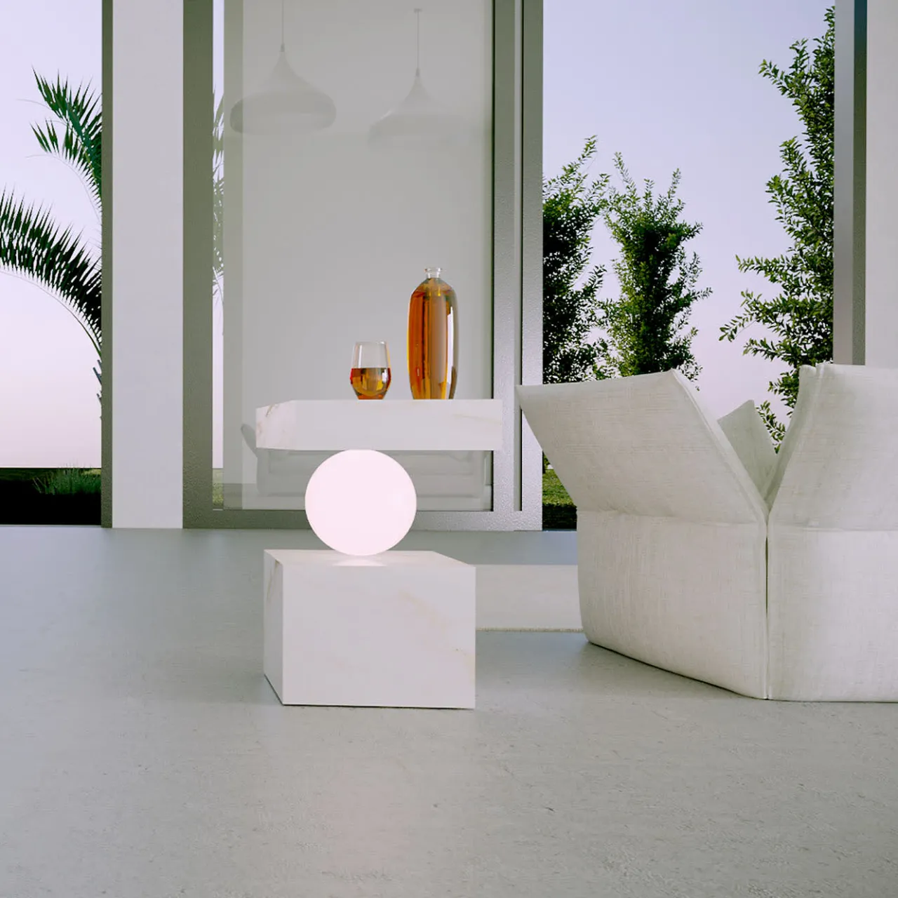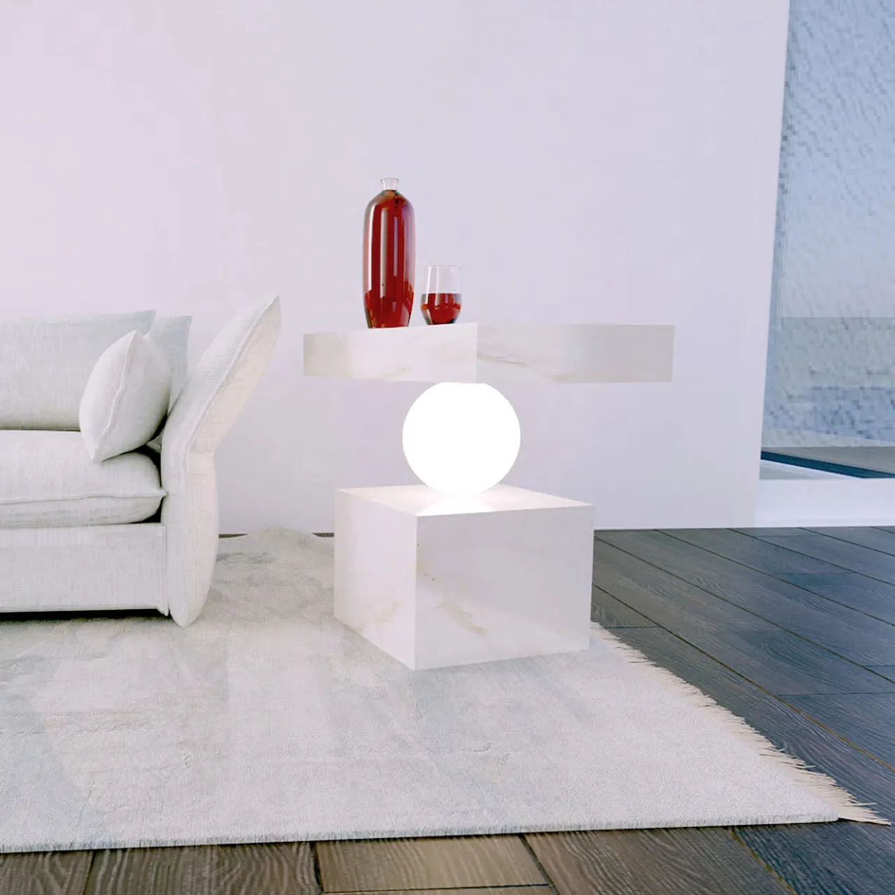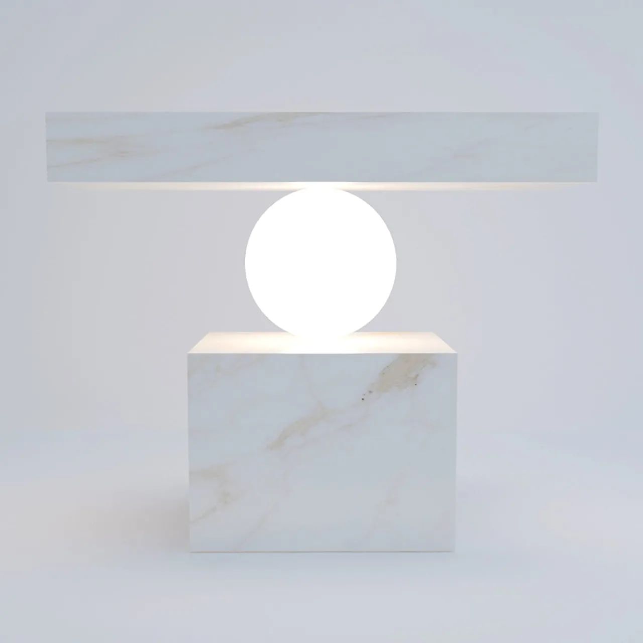 Il pregiato marmo Calacatta è cesellato in eleganti volumi geometrici in questo singolare tavolino. Il globo di vetro centrale, incastonato tra lo spesso piano e la base a blocchi, svolge una funzione strutturale essenziale e irradia una calda luce nell’ambiente circostante. Disponibile anche nella versione in marmo Marquinia nel catalogo Artemest.