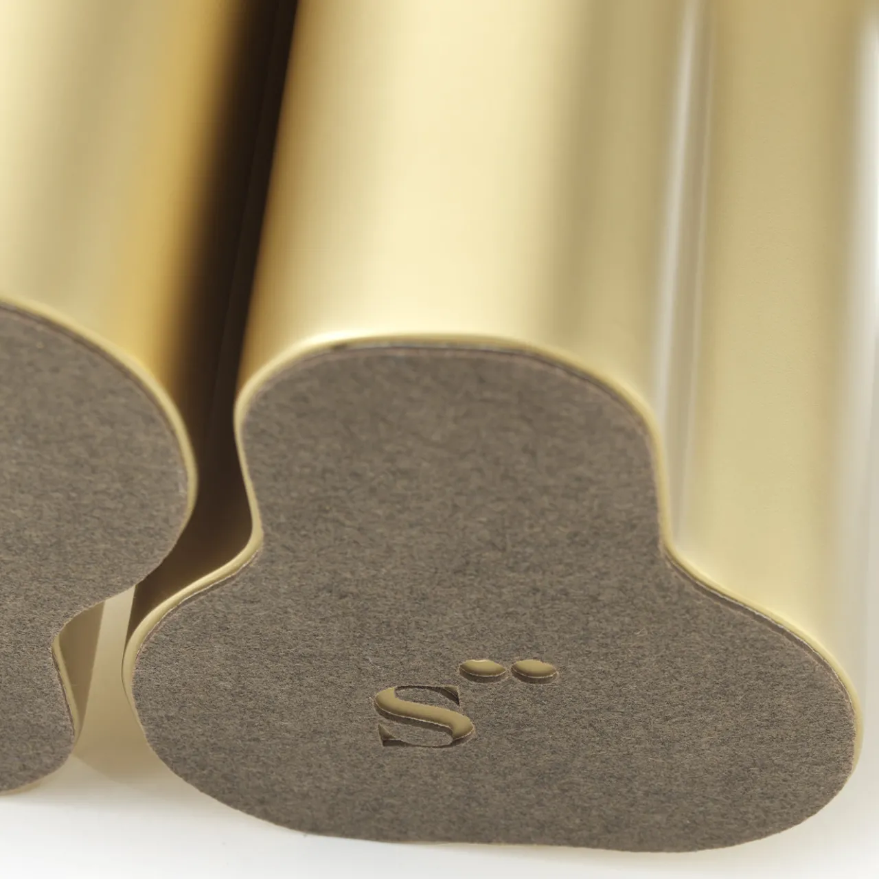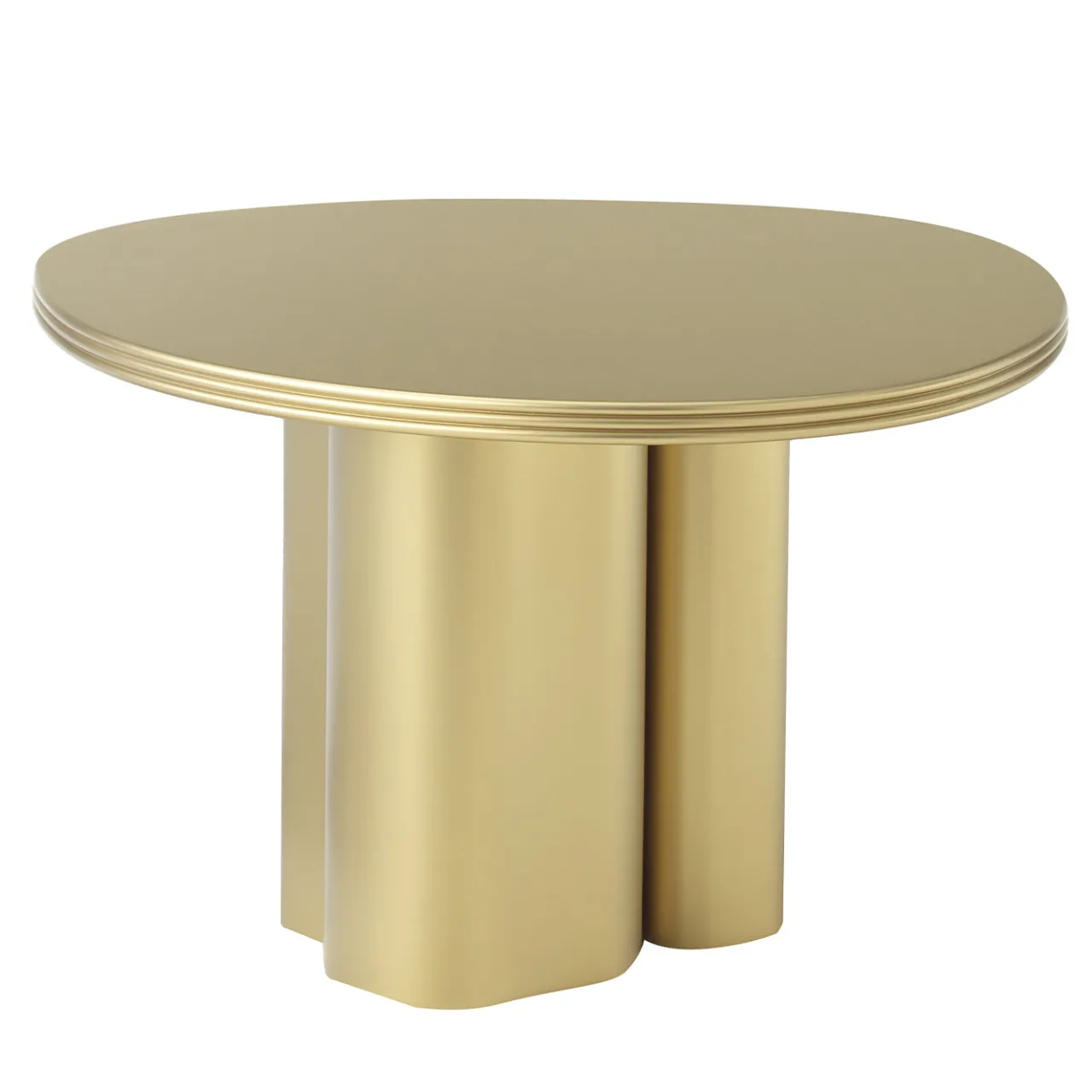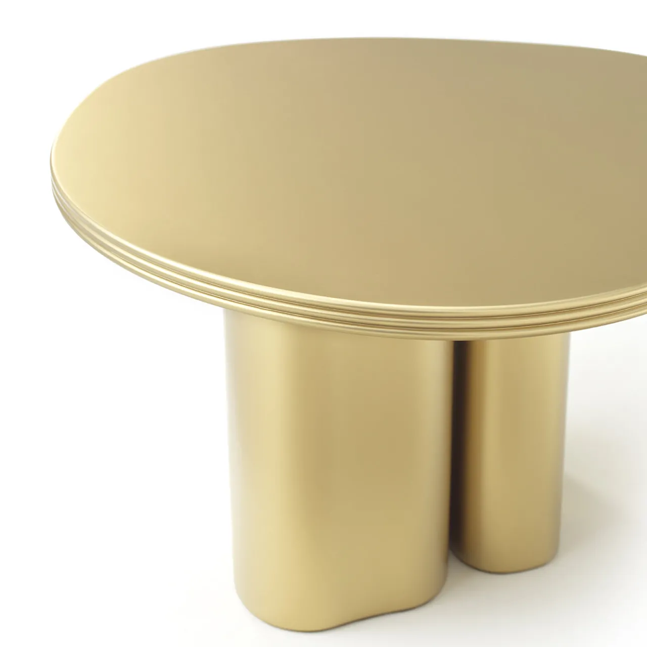 Questo tavolino da caffè presenta un piano a tre bordi che aggiunge una sottile dimensione alla sua silhouette slanciata. Il piano e le gambe sono rifiniti in una vernice oro opaco, offrendo un’estetica raffinata e moderna. La base è composta da tre forme cilindriche intrecciate, contribuendo alla sua presenza scultorea e supporto stabile. Ideale come elemento d’impatto in spazi abitativi contemporanei.