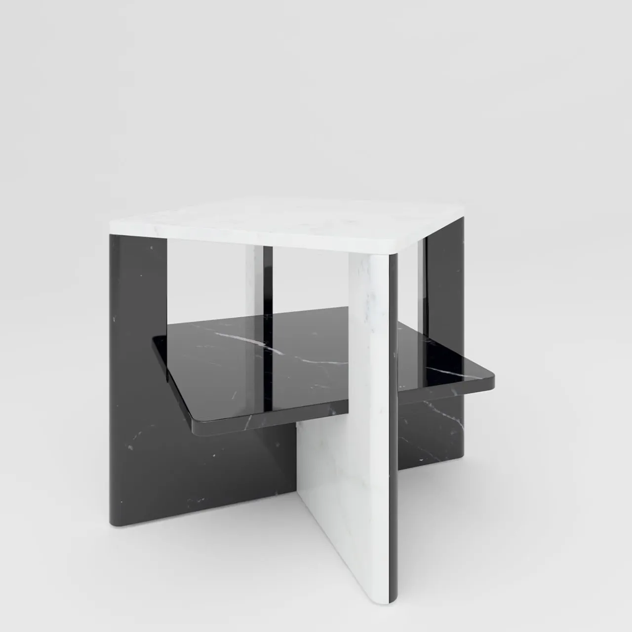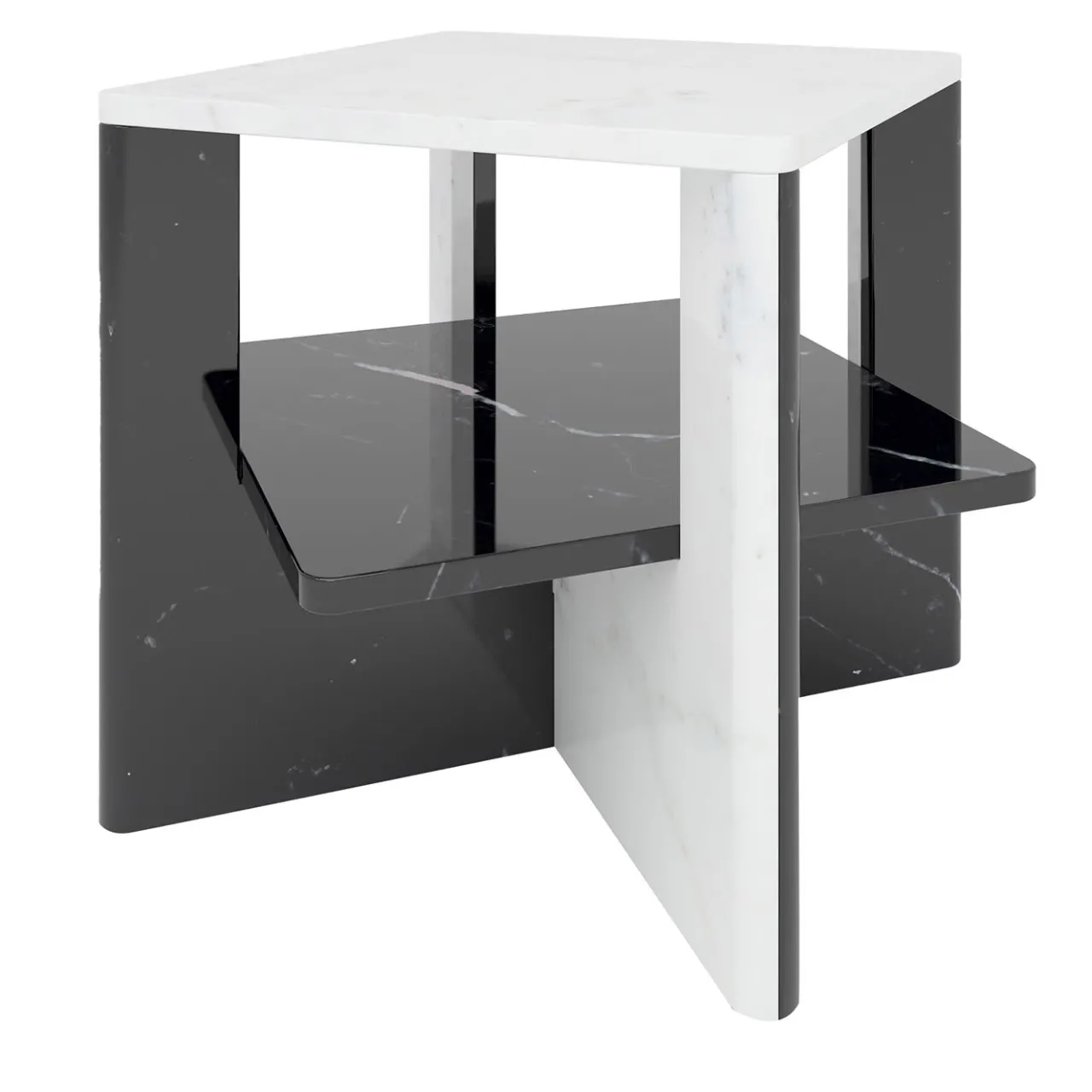 Un pezzo superbo per un interno raffinato, contemporaneo o minimal, questo splendido tavolino da caffè è disegnato in esclusiva da Antonio Saporito e interamente scolpito in marmo di lusso. Caratterizzato da due lastre a forma di U che si intersecano e che sostengono un ripiano superiore e uno inferiore, crea un accattivante gioco di pieni e vuoti esaltato dall’elegante contrasto cromatico. La finitura lucidata a mano mette in evidenza le delicate venature naturali delle pietre bianche e nere.