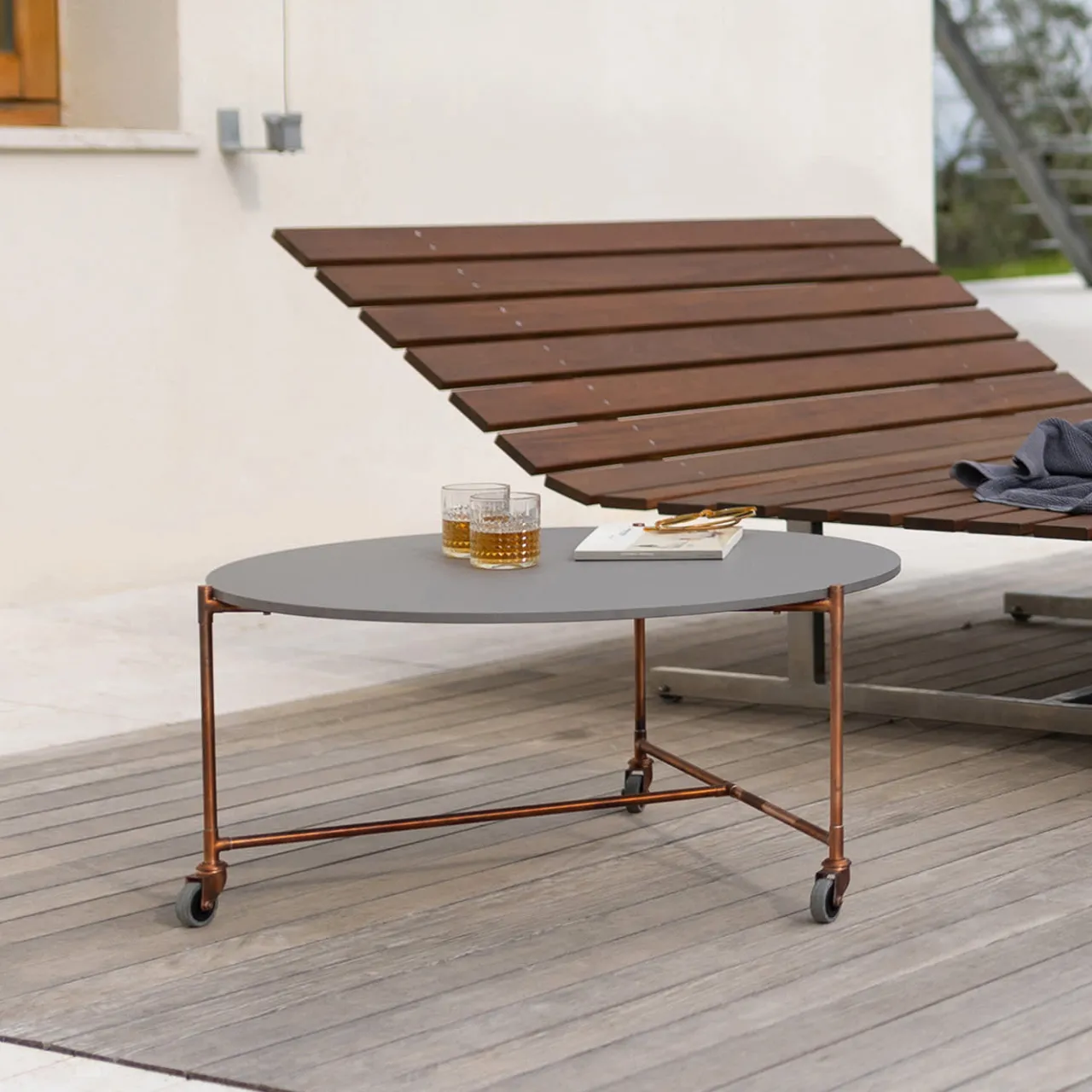 Un tavolino leggero che può essere adattato a diversi usi e circostanze. È costituito da tubi di rame collegati da raccordi a “T” in rame, che formano una triangolazione in grado di sostenere una sottile superficie circolare in HPL.