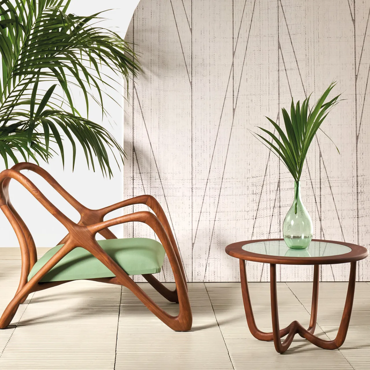 Il tavolino Nanto è caratterizzato da un piano in vetro opalino che richiama la delicatezza e la trasparenza delle ali di farfalla, lasciando intravedere la base scultorea in legno sottostante. La struttura fluida e curvilinea crea un equilibrio armonioso tra leggerezza visiva e calore tattile, traducendo forme naturali in un’elegante maestria artigianale. Pensato come tavolo laterale di dimensioni medie, arricchisce gli spazi esterni con una presenza raffinata, discreta e funzionale.
