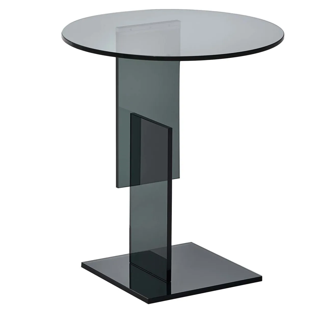 Perfetto pezzo d’accento da collocare in un salotto moderno o per arricchire la zona d’ingresso, questo tavolo in vetro ha una silhouette dinamica e astratta ispirata al tavolo ”Schroëder” disegnato nel 1923 da Gerrit Thomas Rietveld. Composto da pezzi geometrici in vetro temperato, due rettangoli perpendicolari formano la gamba, decentrata rispetto alla base quadrata e al piano rotondo. Mentre i pezzi delle gambe sono incollati tra loro, sia la base che il piano sono assemblati con una piastra in acciaio lucido. Presentato in grigio fumo, questo tavolo è disponibile anche in vetro trasparente extrachiaro con un inserto in vetro blu, giallo o rosso.