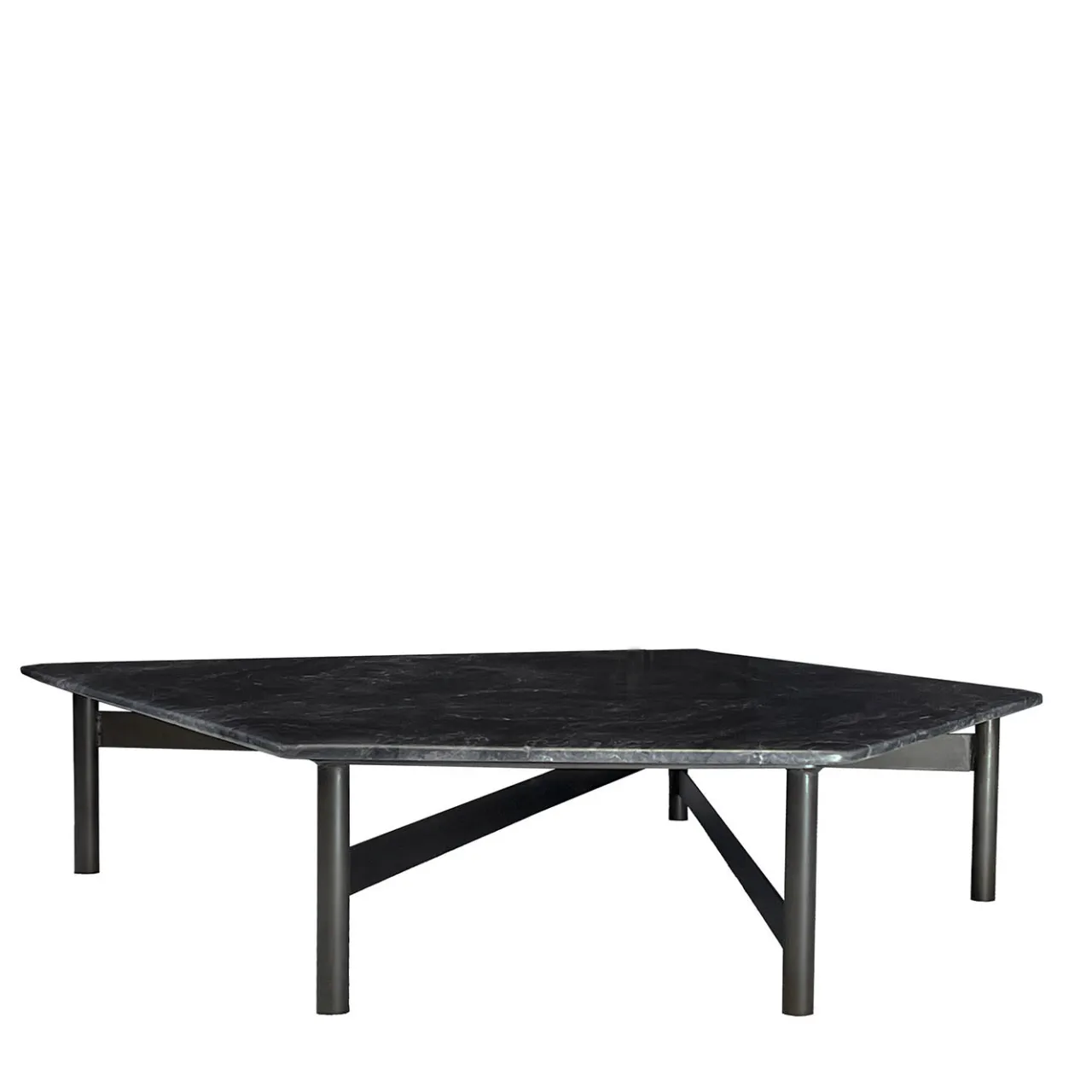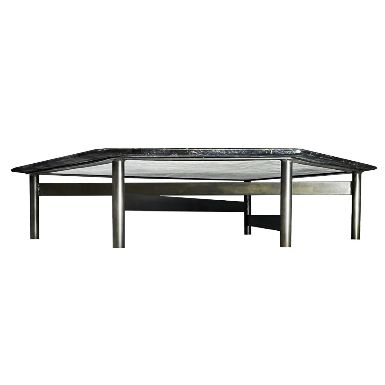 Riferimenti geometrici e industriali caratterizzano questo tavolino della collezione Eneolitica. Accattivante nel suo aspetto asimmetrico, è composto da un piano tagliato a poligono in marmo Dark River che poggia su una dinamica base in ferro rifinita a mano in ottone brunito. Il processo di lavorazione artigianale fa sì che ogni pezzo sia unico.