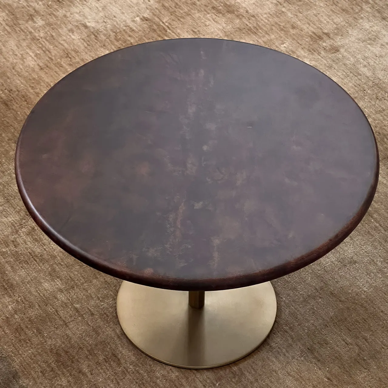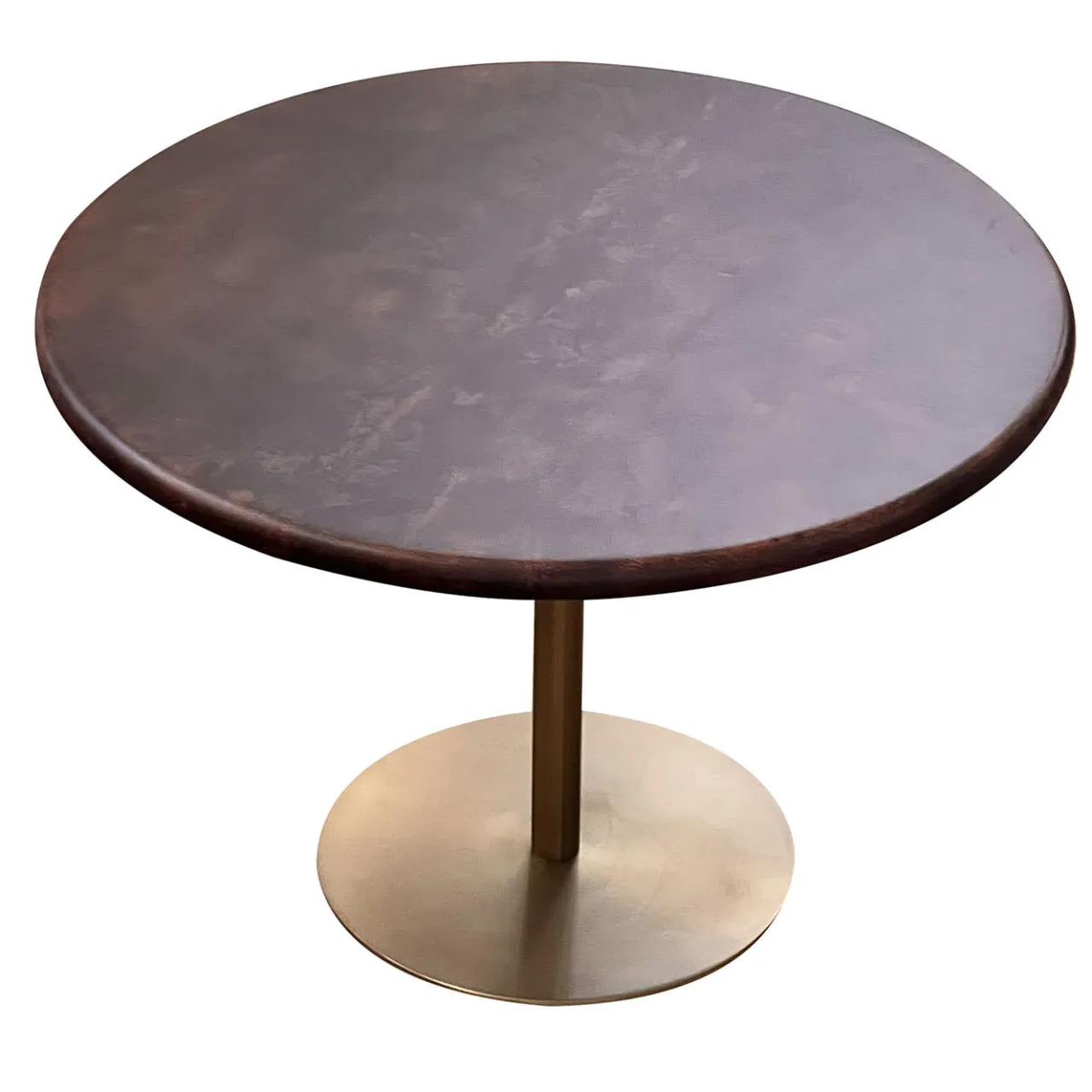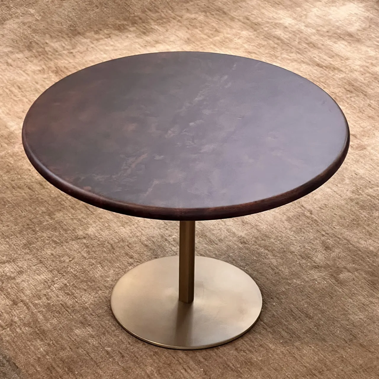 Questo tavolino in acciaio inox appartiene alla collezione Ester di coffee tables di mg12, disegnata da Monica Geronimi. In questa versione Ester, una visione unica di raffinatezza contemporanea, è caratterizzato da gambe in acciaio brunito e da un design minimalista, arricchito dal piano in Pergamena color tabacco. Questo materiale antico è noto per la sua delicatezza, simbolo di eleganza e raffinatezza. Disponibile in diversi colori, su richiesta.