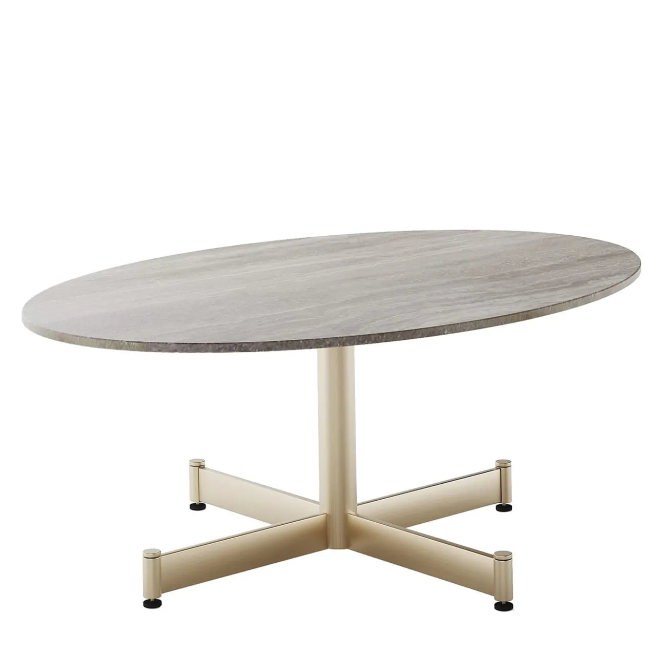 Altrettanto splendido in un moderno spazio contract o domestico, questo tavolino ovale è un esercizio di profili minimalisti nobilitati da finiture preziose. Il motivo a pietra che contraddistingue il piano ovale in alluminio vuole essere ravvivato dalla finitura champagne scelta per la base a quattro razze in acciaio. Per altre versioni e finiture, contattare il Concierge. Adatto sia per interni che per esterni.