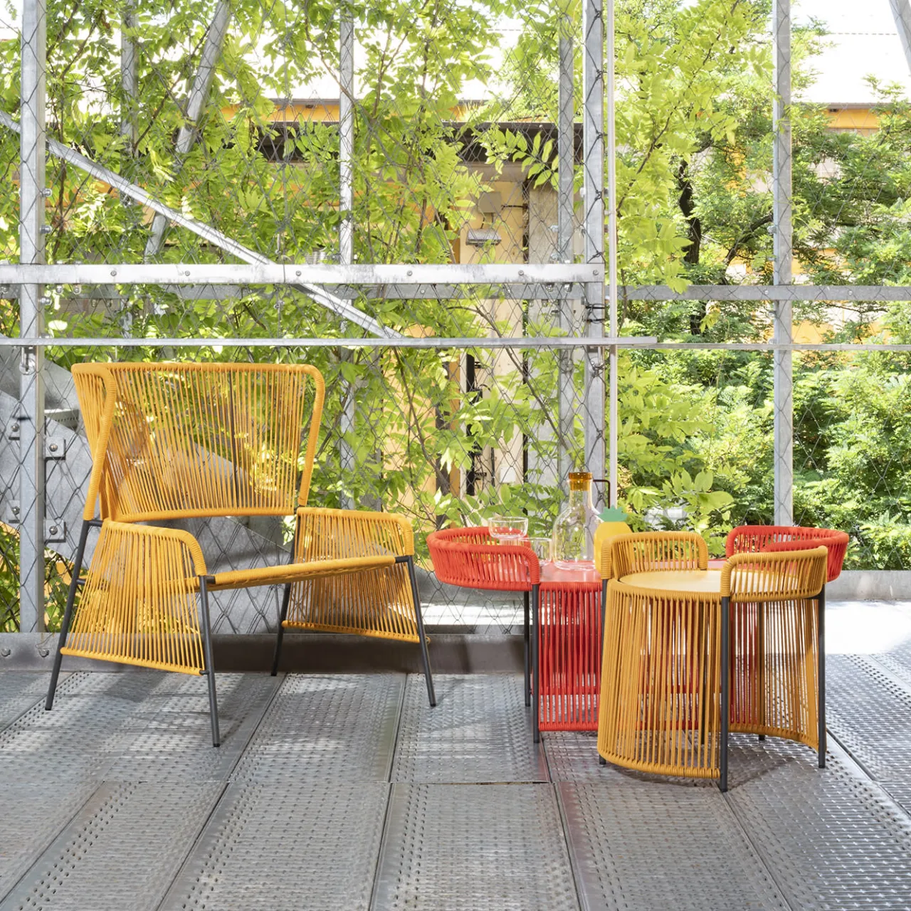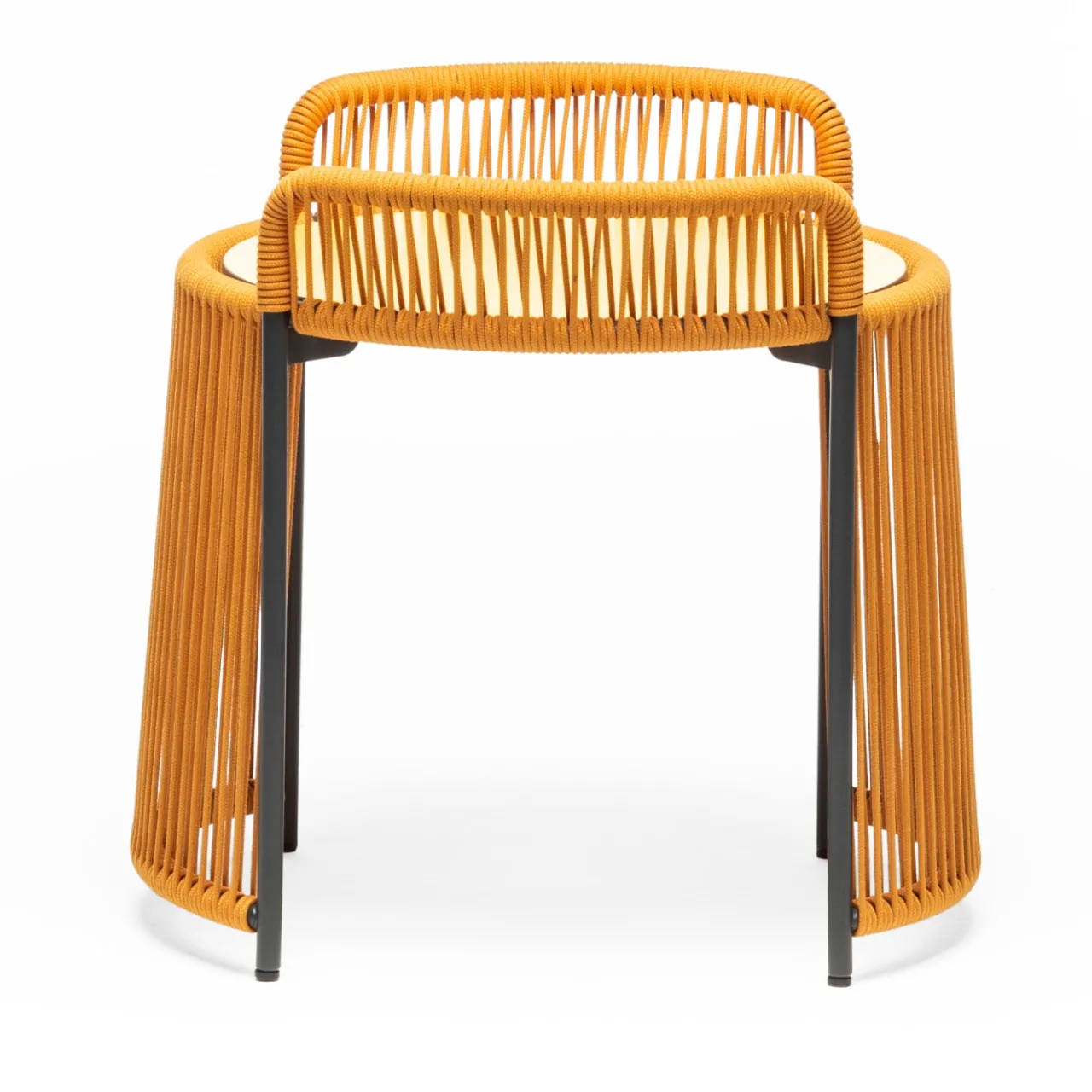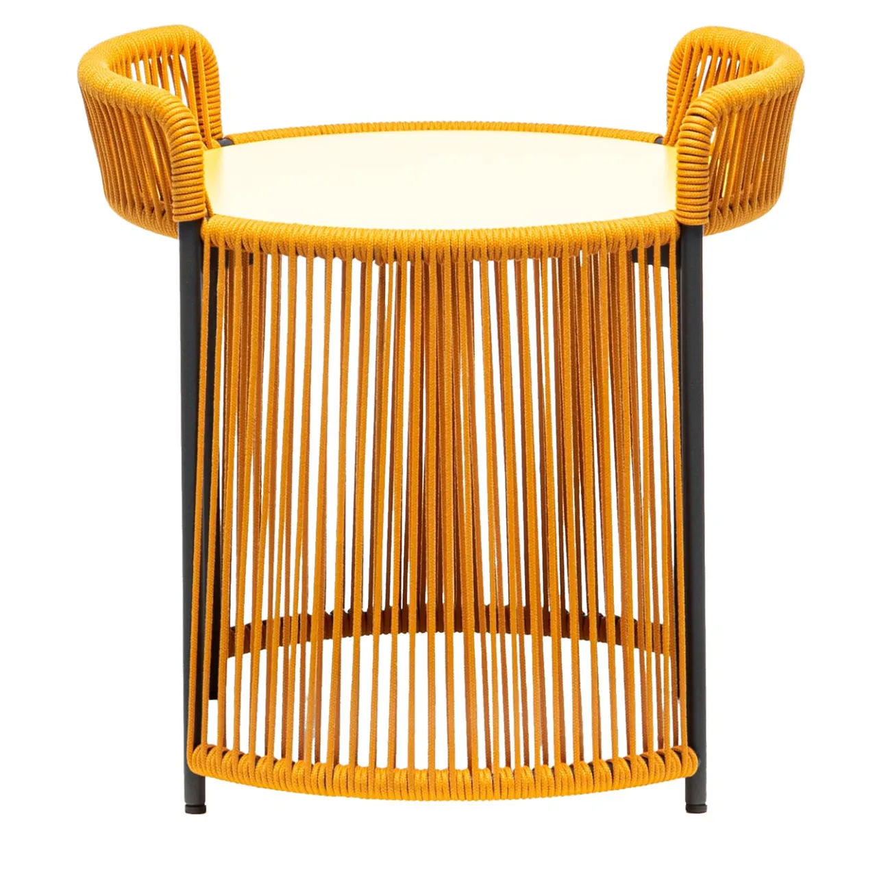 Sottili corde marine di colore giallo, abilmente e pazientemente avvolte attorno a una sottile struttura in acciaio verniciato a polvere in grigio antracite, conferiscono a questo tavolino un aspetto accattivante. Le corde, oltre a evocare atmosfere marine, creano un intricato insieme di linee il cui disegno cambia aspetto a seconda del punto di vista. Il piano rotondo in HPL completa il design. Adatto all’uso esterno, è disponibile in diverse opzioni di colore; per maggiori dettagli, consultare il Concierge.