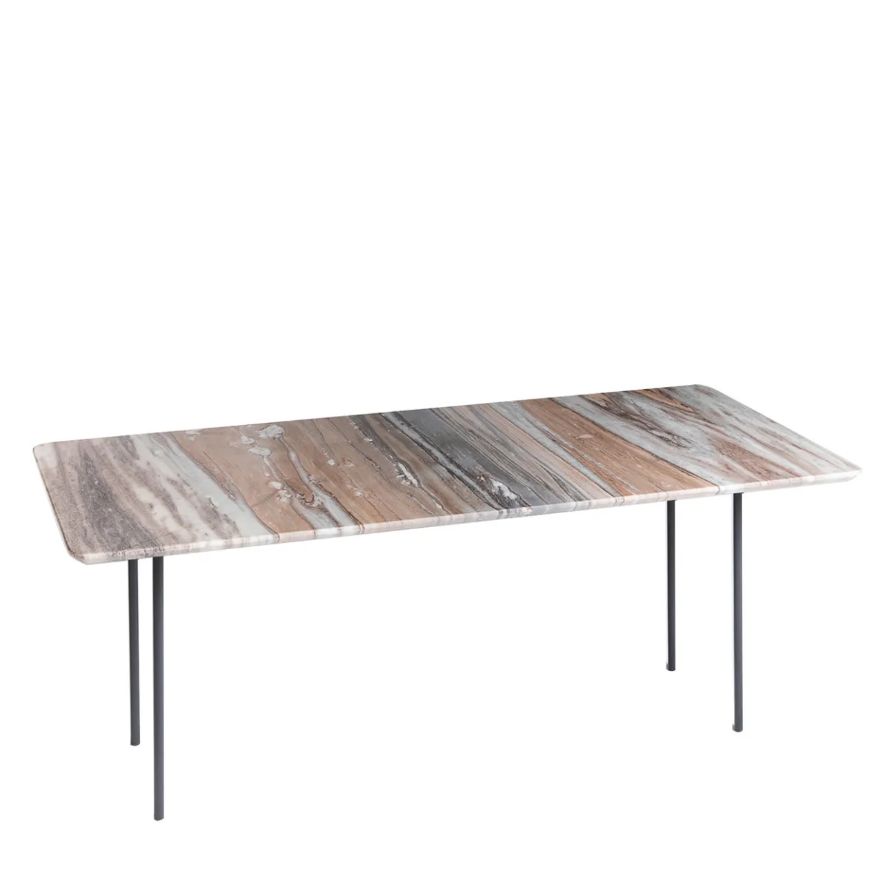 Questo magnifico tavolino è l’esempio perfetto delle caratteristiche ipnotiche e uniche della natura, incarnate dalle singolari sfumature che definiscono il suo piano in marmo Palissandro. Rettangolare con angoli e spigoli arrotondati, il grande piano poggia solidamente su una base in ferro laccato grigio composta da quattro gambe tubolari, disponibili anche in oro o nero. Il tipo di marmo è personalizzabile, si prega di chiedere al Concierge per le opzioni.