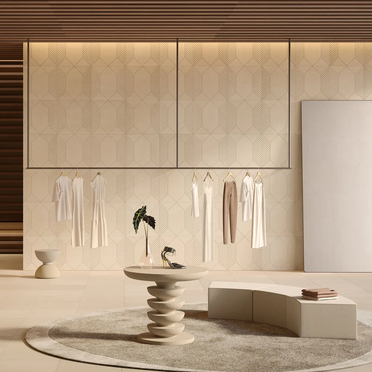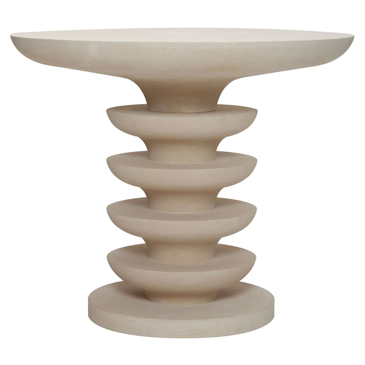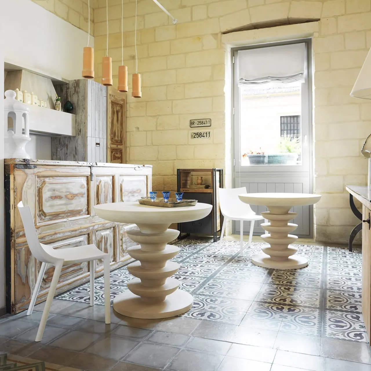 La forma insolita della collezione Ondulation di Matali Crasset nasce da un progetto estratto da un’animazione digitale: un sogno ipnotico in cui si viaggia in un paese immaginario, arrivando in una città dove le torri ondeggiano dolcemente per rasserenare gli abitanti. La pietra naturale Pimar prende la forma di una serie di strutture simili alle torri ondeggianti. Il risultato è una collezione di oggetti composta da un tavolo, uno sgabello e un vaso, interamente realizzati in pietra attraverso la tecnica della tornitura.