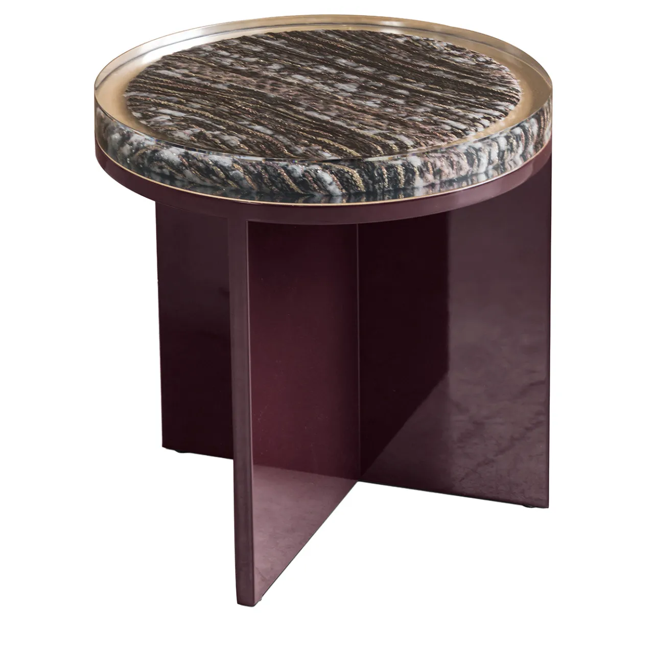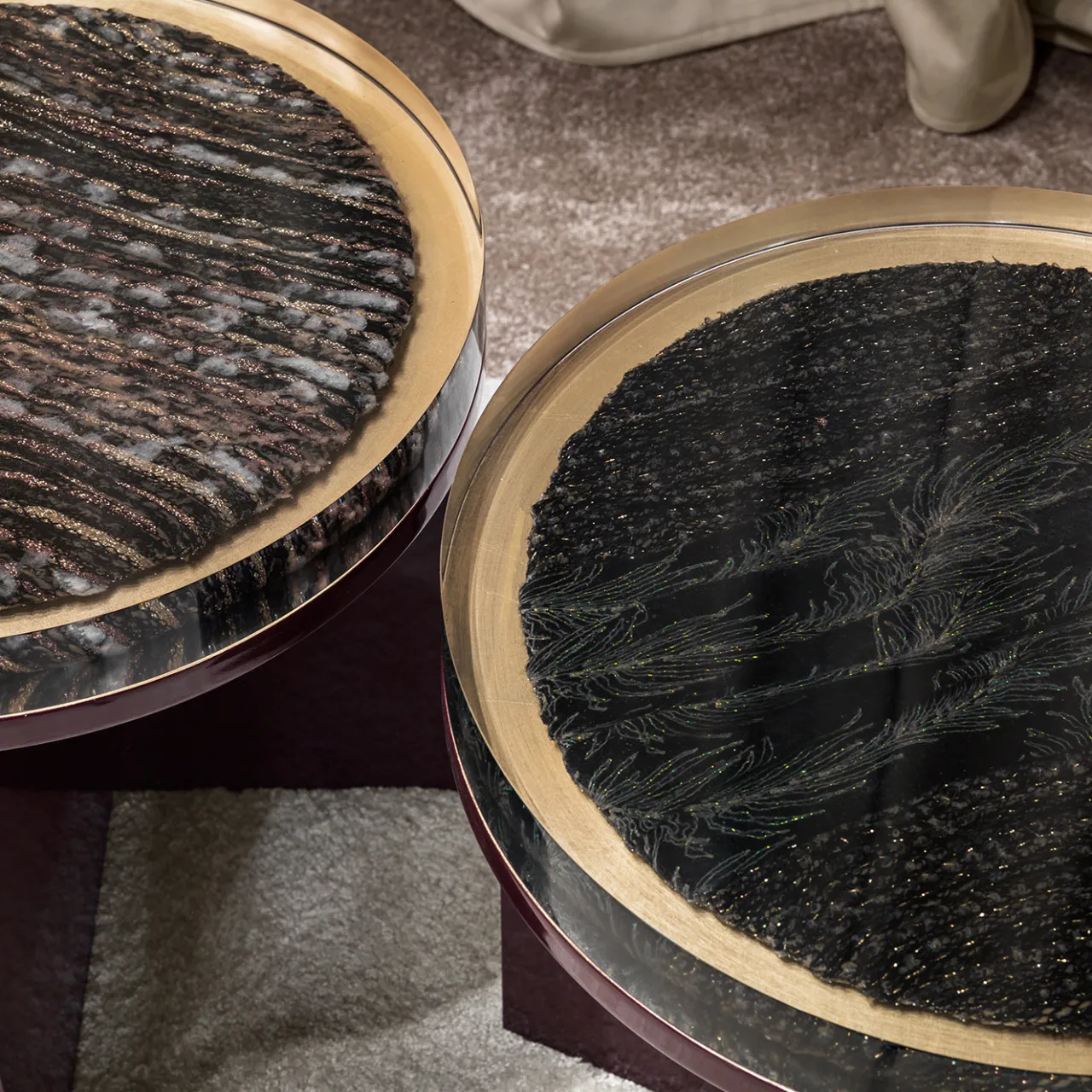 Il tavolino Kir presenta una superficie rotonda in resina che racchiude un tessuto progettato su misura, offrendo una texture visiva distintiva. La base è realizzata in legno con una finitura laccata lucida, disposta in una struttura a croce per stabilità ed equilibrio. Questo tavolo di dimensioni medie unisce elementi artistici con un design funzionale, rendendolo un raffinato pezzo centrale adatto per spazi abitativi moderni.