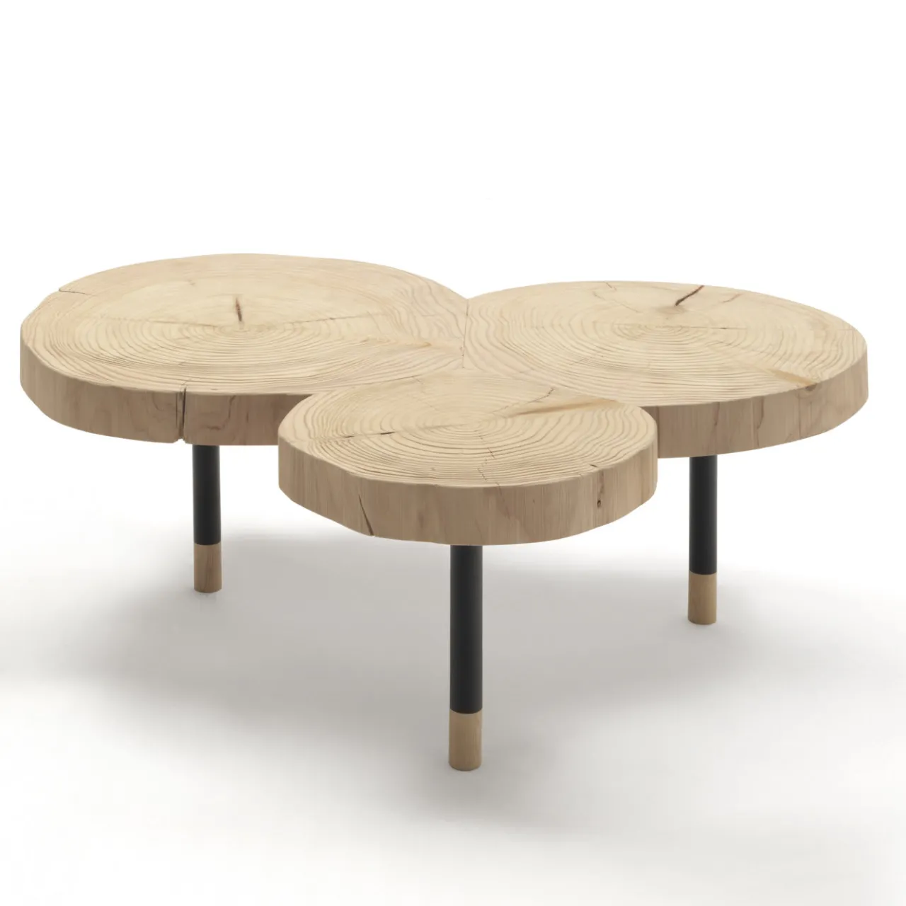 L’inserimento di tre tronchi di cedro massiccio sabbiato rende questo tavolino di grande impatto il protagonista di ogni spazio abitativo. Le gambe sono in ferro laccato con punta in legno.