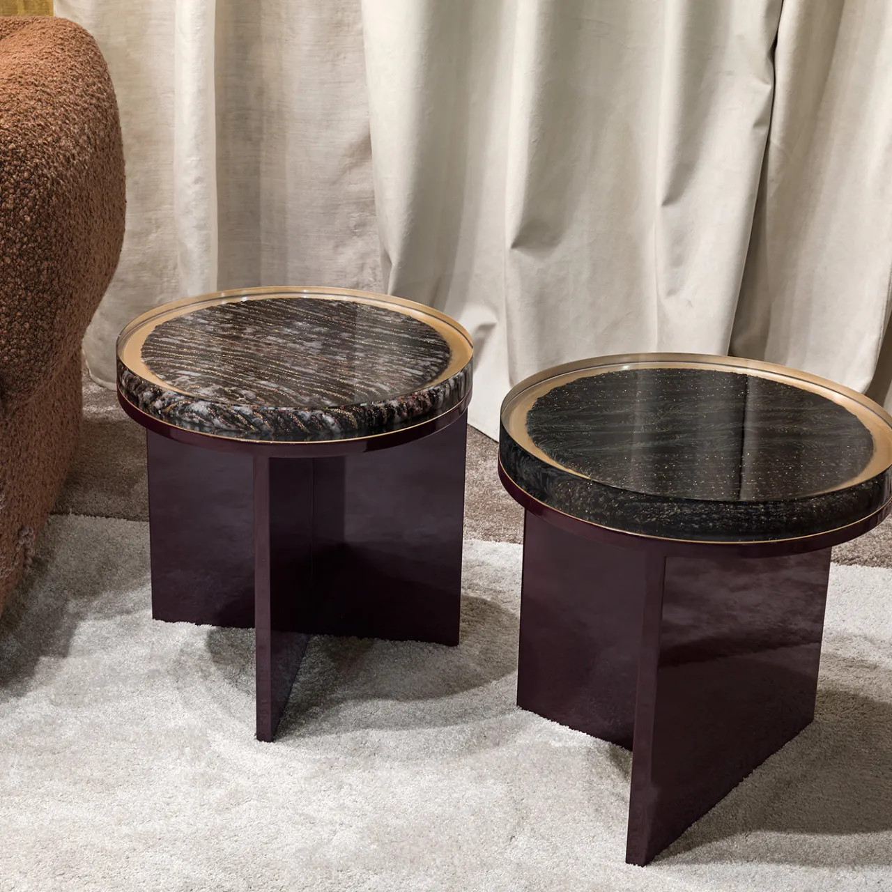 Questo tavolino presenta un piano rotondo di dimensioni medie realizzato in resina con un dettaglio di tessuto progettato su misura integrato che aggiunge profondità e texture. La base in legno laccato lucido sostiene il piano con una forma scultorea moderna composta da pannelli incrociati. Questo design fonde materiali innovativi con una silhouette elegante, rendendolo un pezzo distintivo per interni contemporanei.