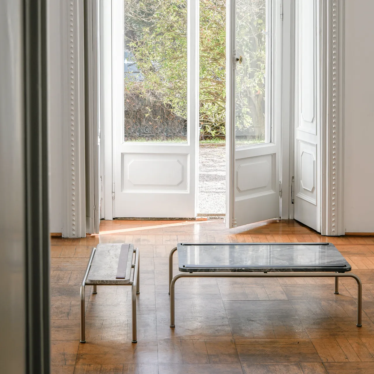 Meravigliosa combinazione di materiali morbidi e duri, di eleganti contrasti di tonalità e texture, questo stupendo tavolino da caffè sarà una preziosa aggiunta a una zona living contemporanea. Poggiato su una base pulita in metallo cromato, presenta un piano in marmo arricchito da due cinture in pelle beige. Questo pezzo è personalizzabile nelle dimensioni e nelle finiture, si prega di consultare il Concierge per ulteriori informazioni.