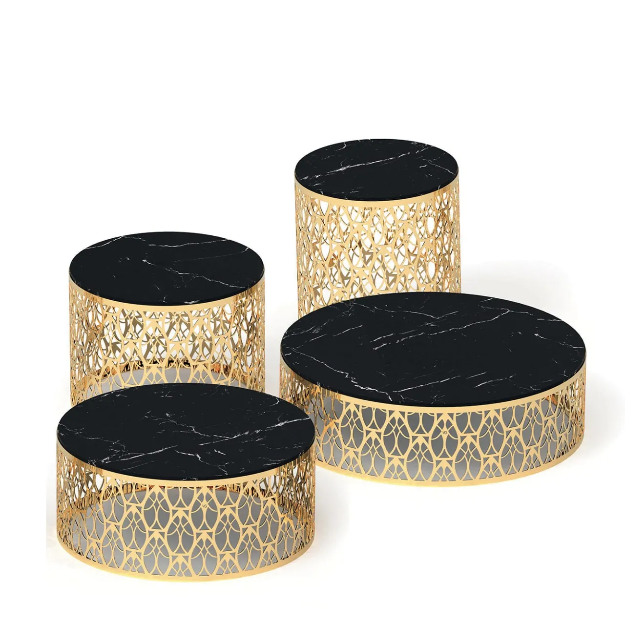 Complemento iconico e audace di un ambiente elegante, questo tavolino fa parte di una serie di tavolini dal carattere maestoso e opulento. Di forma arrotondata, presenta una base in metallo dorato di ispirazione arabeggiante, sormontata da una superficie in marmo nero. Disponibile in altre dimensioni, consultare il catalogo Artemest per le opzioni.