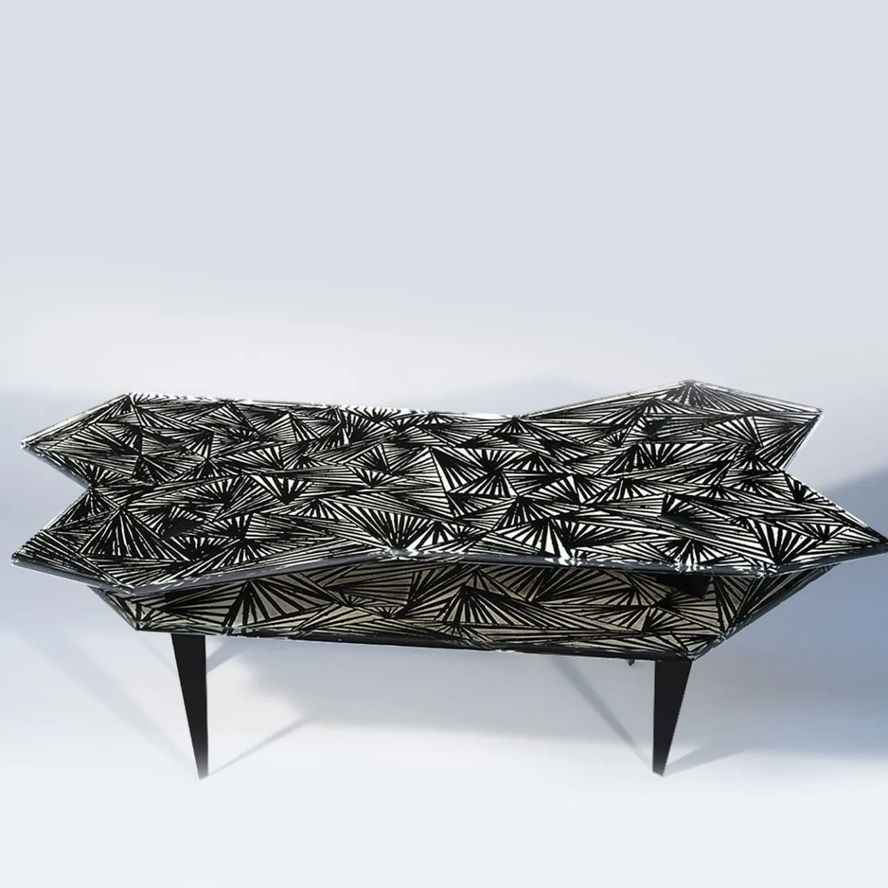 Il tavolino “Montén” riesce a essere estremamente contemporaneo e classico allo stesso tempo. Il tavolo è composto da due piani in vetro con diverse forme irregolari. L’intero sostegno è dato dalle gambe in ottone con finitura nera opaca. Le quattro gambe attraversano completamente i due piani in cristallo. I vari intagli creano un motivo accattivante, originale ed elegante. Ogni imperfezione è da considerarsi una garanzia di estrema naturalezza e artigianalità. Questo pezzo è unico.