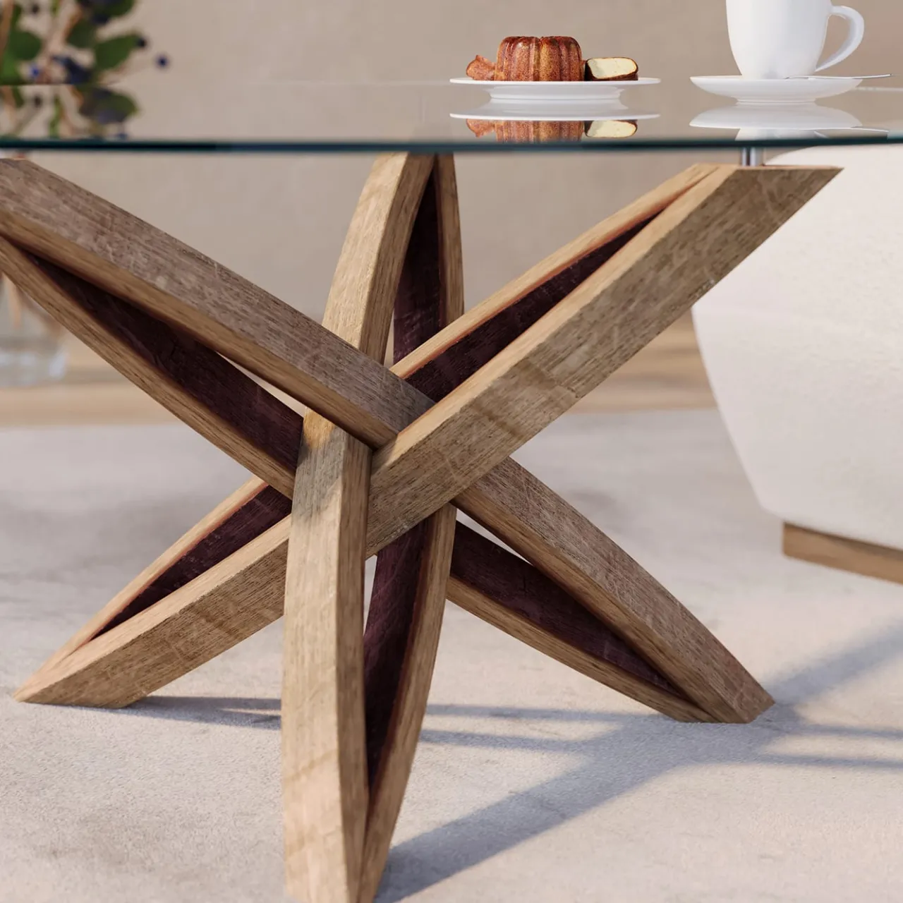Narni è un tavolino in cui equilibrio e dinamismo geometrico giocano insieme. La sua struttura ellittica è il risultato del riflesso di due doghe che sostengono con grazia un piano circolare in vetro, culminando in un intreccio di morbidezza ed eleganza. Ogni ellisse sussurra il racconto del percorso di invecchiamento del vino, mentre le sfumature e le impronte del tempo conferiscono a ogni Narni un fascino naturale e personalizzato.