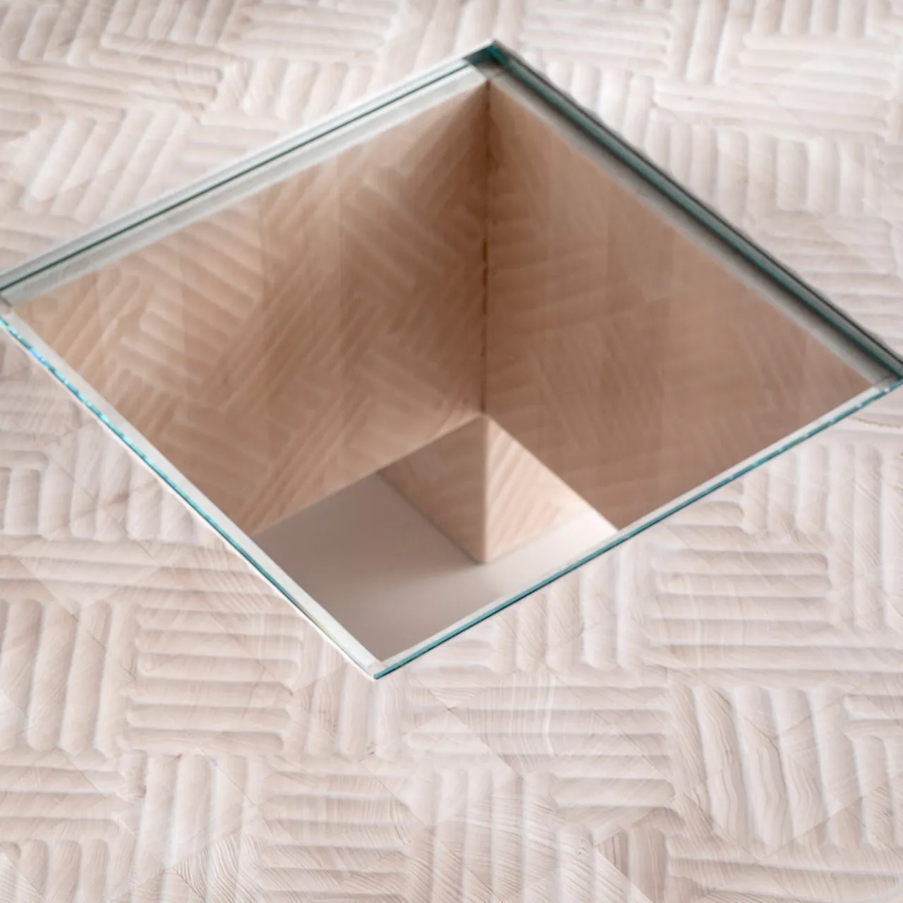 Un design elegante che sarà al centro della scena in un arredamento contemporaneo o rustico-chic, questo elegante tavolino da caffè è una scultura monolitica che evoca le sale delle case degli antichi romani. Lineare e altamente geometrico, è realizzato in legno intagliato a mano con una pialla. Il piano è ricoperto da un vetro trasparente al centro.