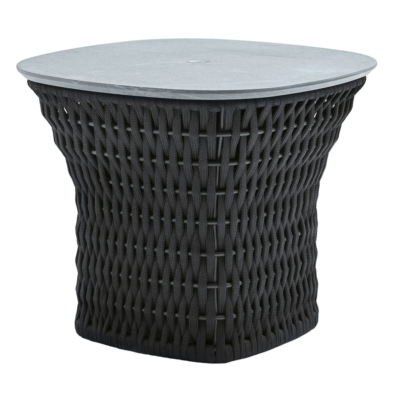 Tavolino da esterno in combinazione di metallo nero satinato trattato in cataforesi e cordame nero intrecciato. Piano in pietra naturale trattata “CARDOSO” con logo Giorgio Collection inserito. Speciale copertura per esterni inclusa nel prezzo.