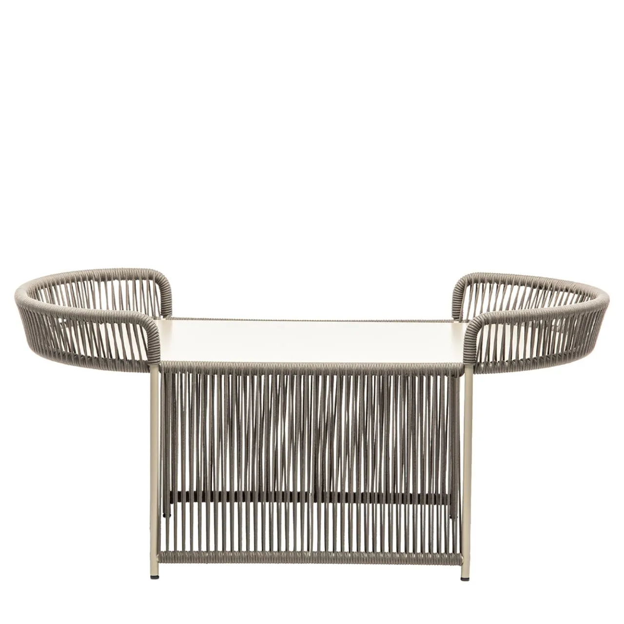 Un’attenta simmetria abbinata a un’originale distribuzione dei volumi rende questo tavolino elegante e slanciato, perfetto per raccogliere i bicchieri per un brindisi speciale su una terrazza o un patio. Il suo tratto distintivo è la corda marina dai toni chiari, abilmente avvolta intorno alla struttura in acciaio verniciato a polvere in una delicata tonalità sabbia, che dà vita a dinamiche trame di linee che si intersecano. Per altre dimensioni e colori, consultare il catalogo Artemest.