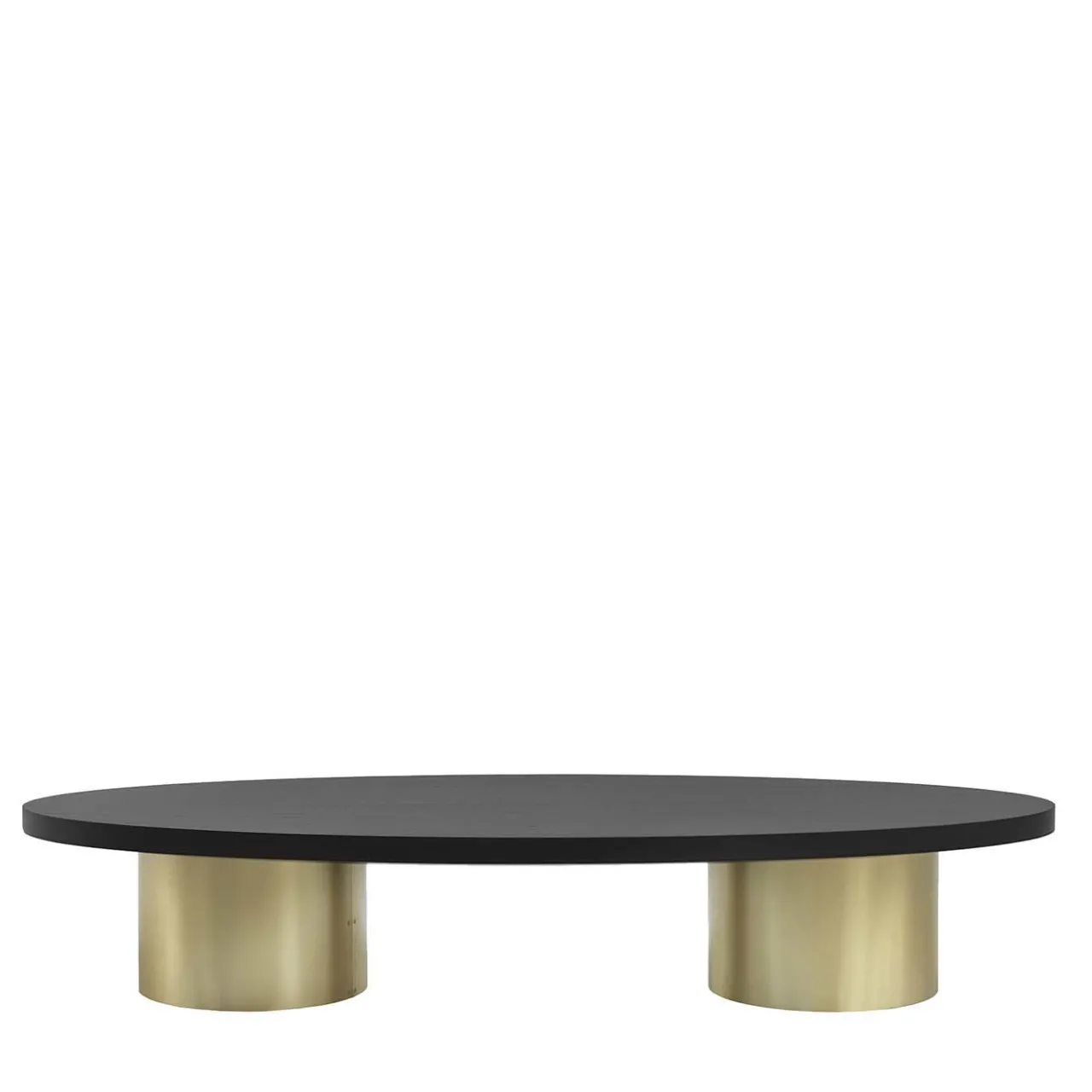 Questo tavolino da caffè conferisce a qualsiasi soggiorno, salotto o ufficio un’ipnotica raffinatezza. Combinazione di tonalità eleganti, presenta un piano ovale in legno di frassino multistrato con finitura laccata nera opaca. La base, composta da due robuste gambe cilindriche, è realizzata in legno massiccio rivestito in ottone satinato.
