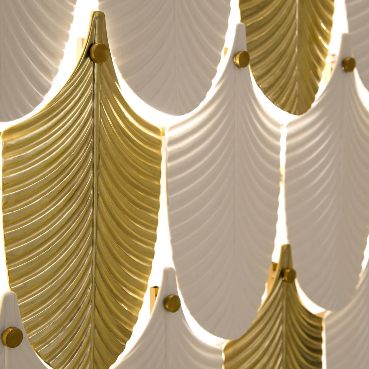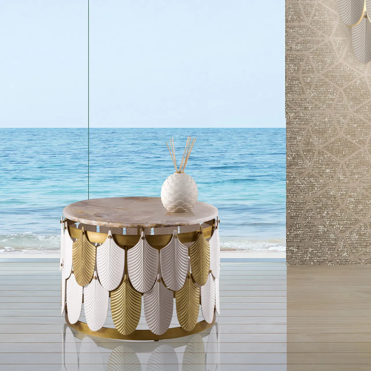 Questo splendido tavolino testimonia la squisita abilità artigianale di Villari e l’uso dei materiali più pregiati. Fa parte della Collezione Home Couture ed è caratterizzato da una struttura cilindrica in ottone, rivestita ai lati da una serie di delicati elementi a forma di piuma in vetro di Murano soffiato a bocca bianco e porcellana con finitura dorata. Il piano in marmo completa questo design sofisticato e di forte impatto visivo.