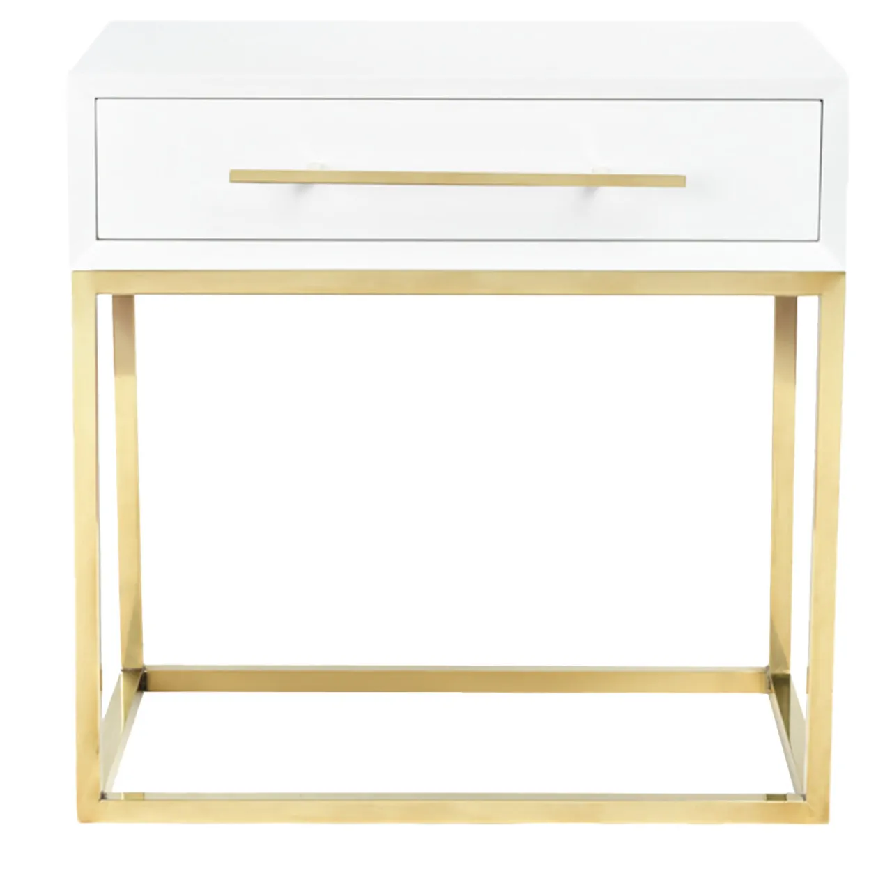 Un pezzo moderno con un tocco di metà secolo, questo tavolino ravviverà squisitamente l’arredamento di un ingresso, di una camera da letto o di un soggiorno. Interamente realizzato a mano, è composto da una struttura in ottone lucido dalle linee geometriche pulite ed essenziali che sostiene un piano in legno laccato bianco lucido. A completare questo splendido design, un ampio cassetto arricchisce il lato anteriore del pezzo. Questo tavolino può essere personalizzato su richiesta in altri colori e finiture del legno.