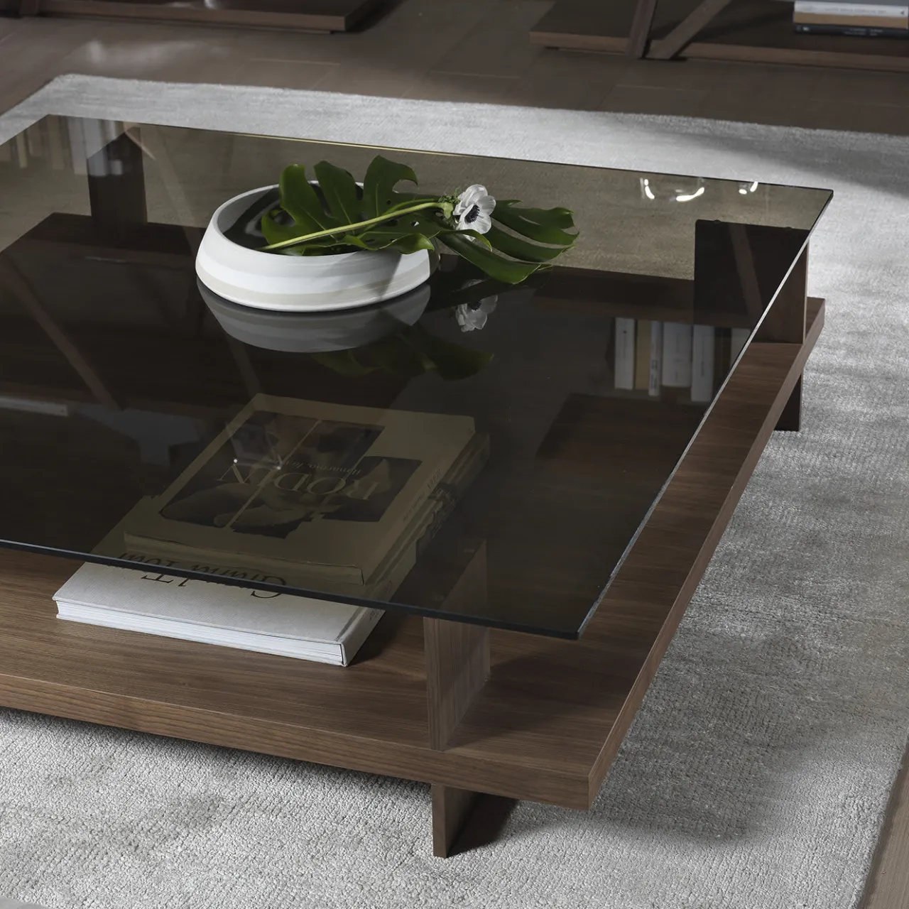 Parte della collezione Corallo, questo tavolino quadrato è sia funzionale (perché offre due superfici espositive visibili) che decorativo (grazie alla sua silhouette solida e armoniosa e all’uso di materiali naturali). Il piano superiore è in vetro trasparente-bronzato ed è sostenuto da una struttura in legno impiallacciato noce canaletto che comprende un piano inferiore trafitto dalle quattro gambe verticali. Anche i dettagli in alluminio sono impiallacciati in noce canaletto. Questo pezzo è disponibile anche con piano in vetro trasparente e finitura tinta wengé o nera; si prega di informarsi presso il Concierge.