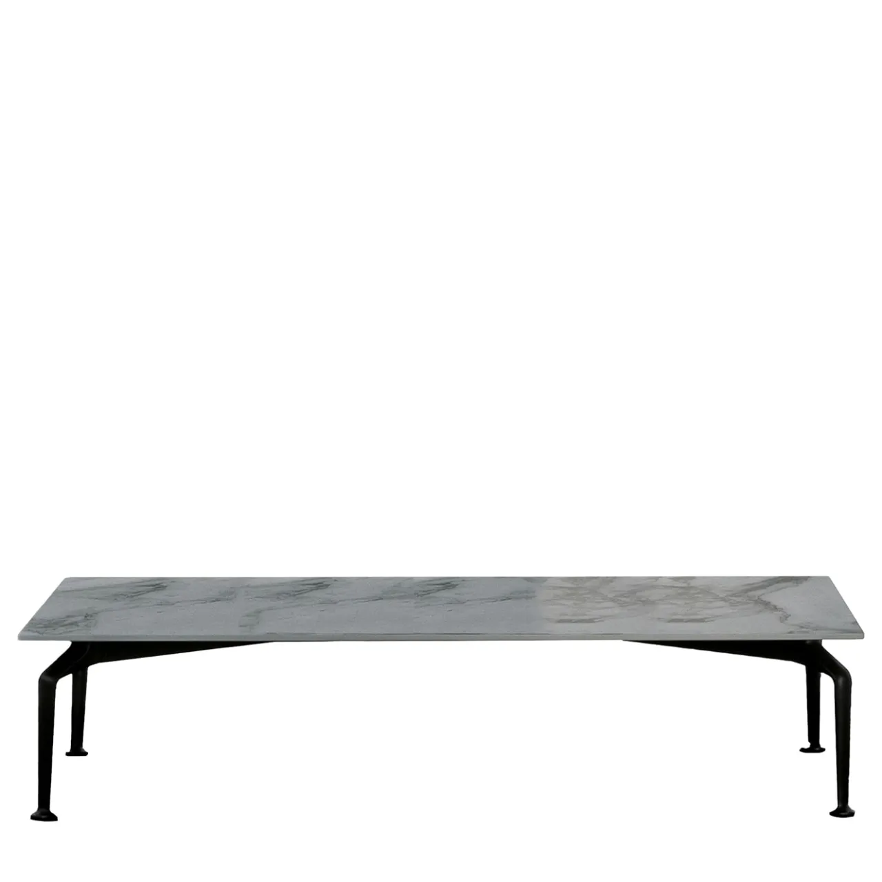 Straordinario progetto di Ludovica e Roberto Palomba che gioca su forme geometriche singolari ma pulite e lineari, questo tavolino rettangolare poggia su gambe affilate e taglienti in alluminio laccato nero. Il prezioso piano è in marmo Calacatta e presenta venature naturali di grande raffinatezza.