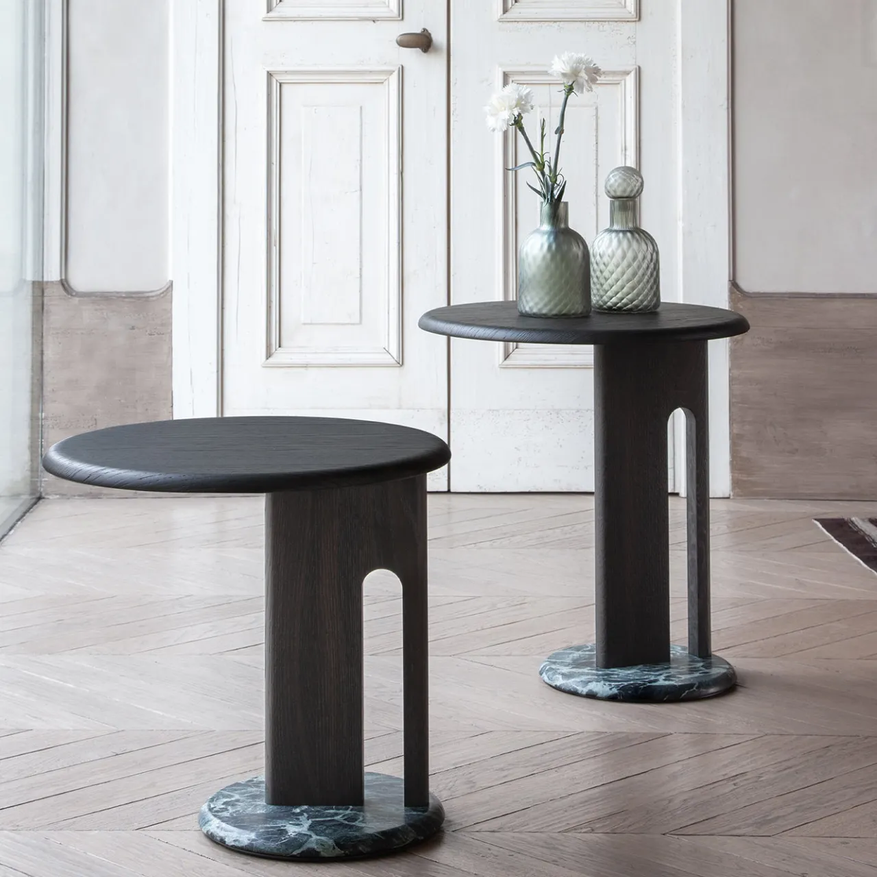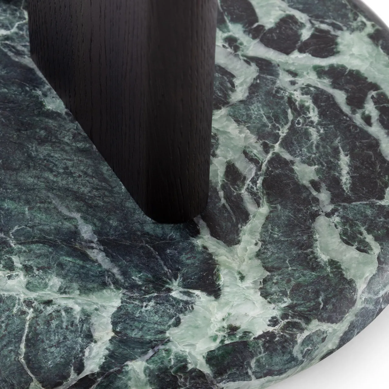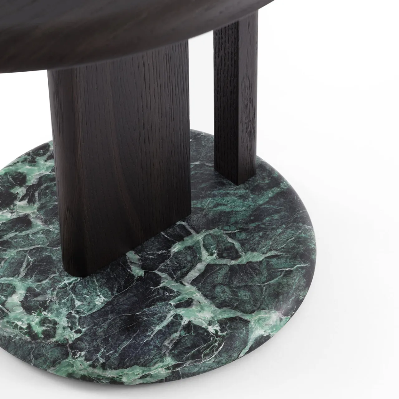 Questo tavolino rotondo presenta un top in impiallacciato di rovere pressato a membrane con una raffinata finitura laguna. La struttura è realizzata in rovere massello tornito che sostiene una robusta base circolare in autentico marmo alpino verde, combinando eleganza naturale e design moderno per un uso versatile negli spazi abitativi.